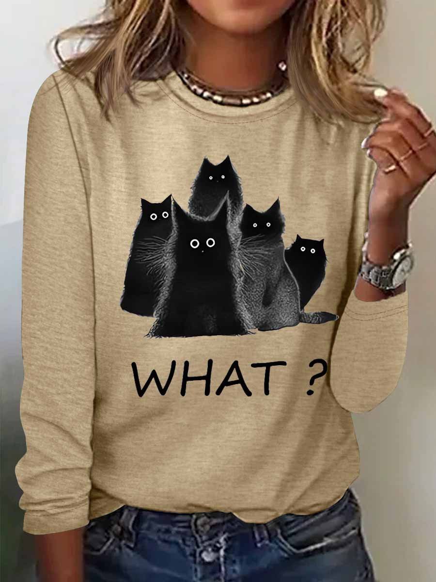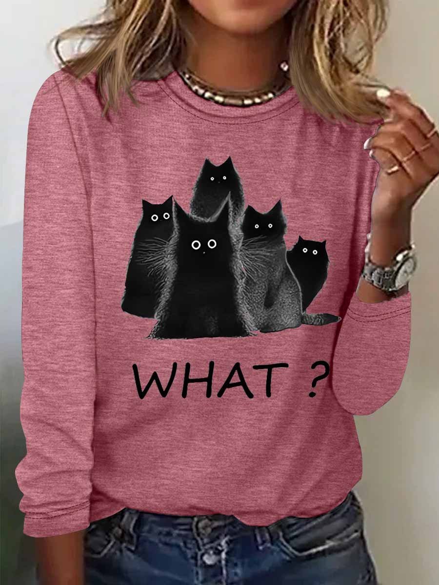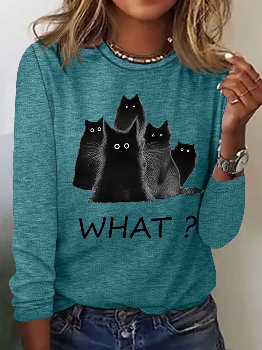 Women's Black Cat What Simple Regular Fit Text Letters Long Sleeve Top
