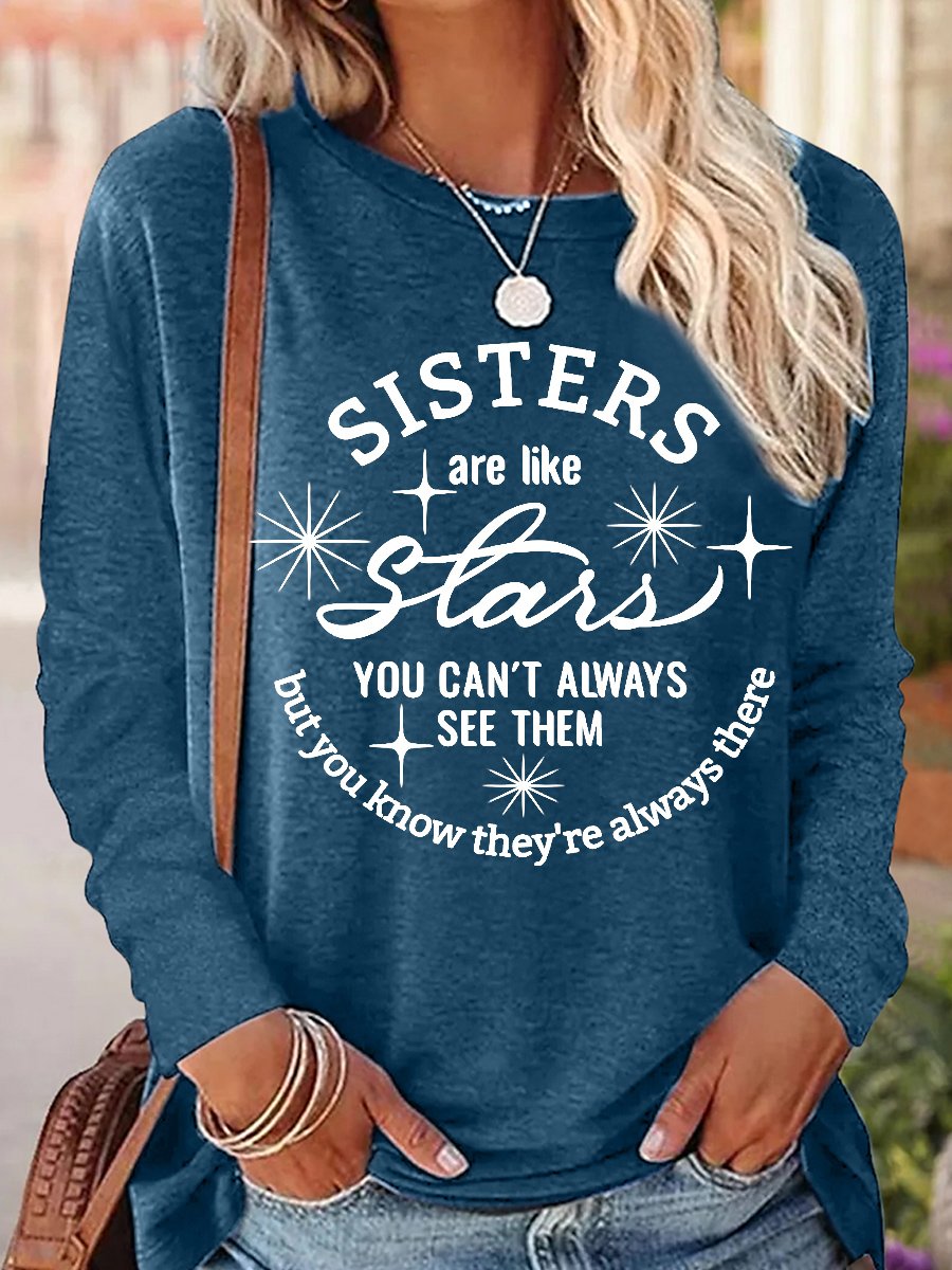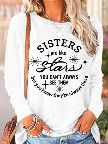 Women's Funny Word Sisters Are Like Stars Regular Fit Cotton-Blend Simple Long Sleeve Top