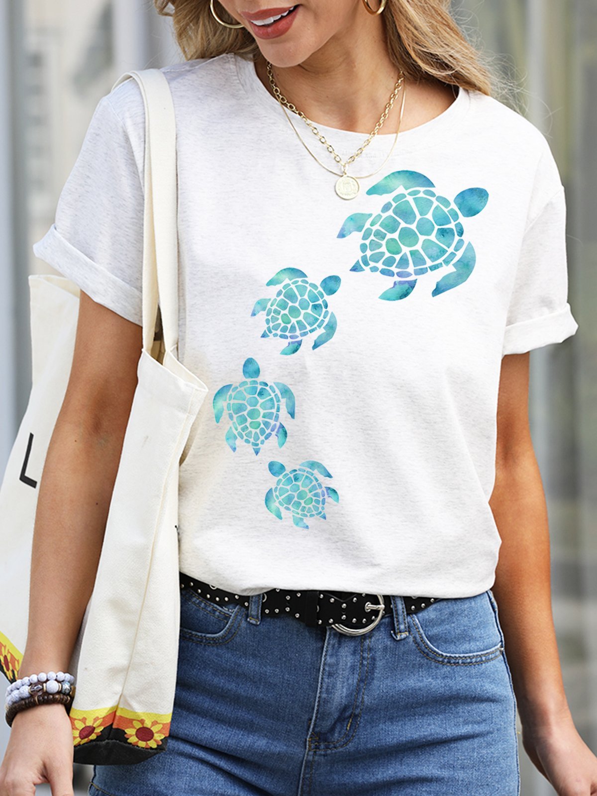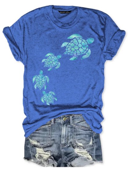 Womens Sea Turtle Watercolor Blue Print Casual T-Shirt
