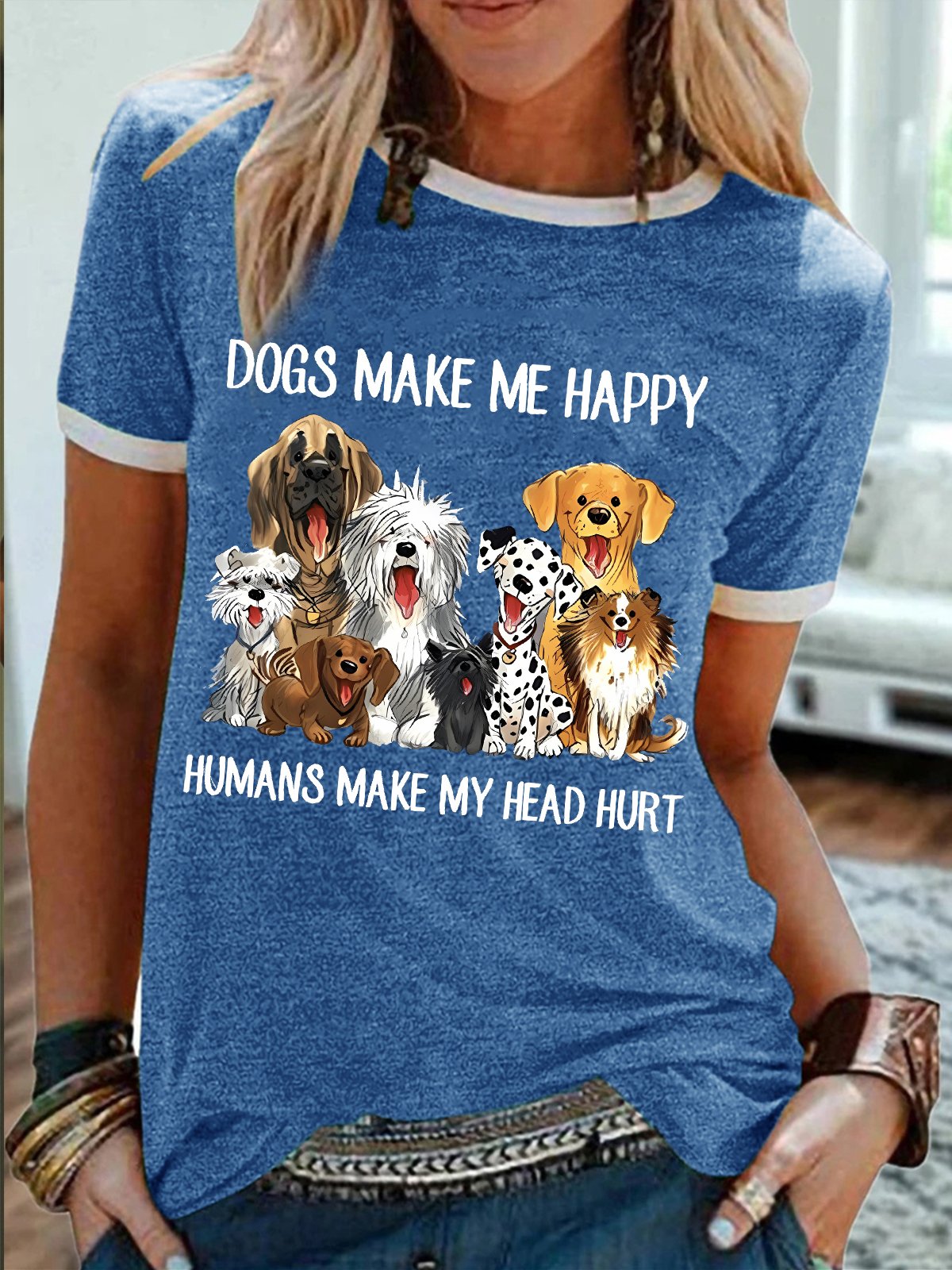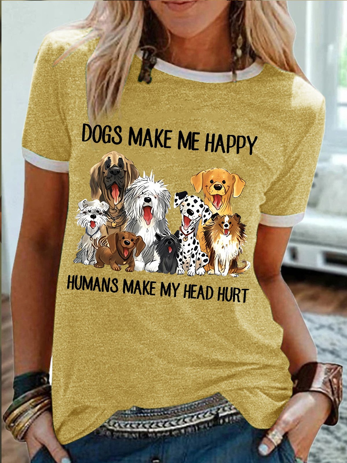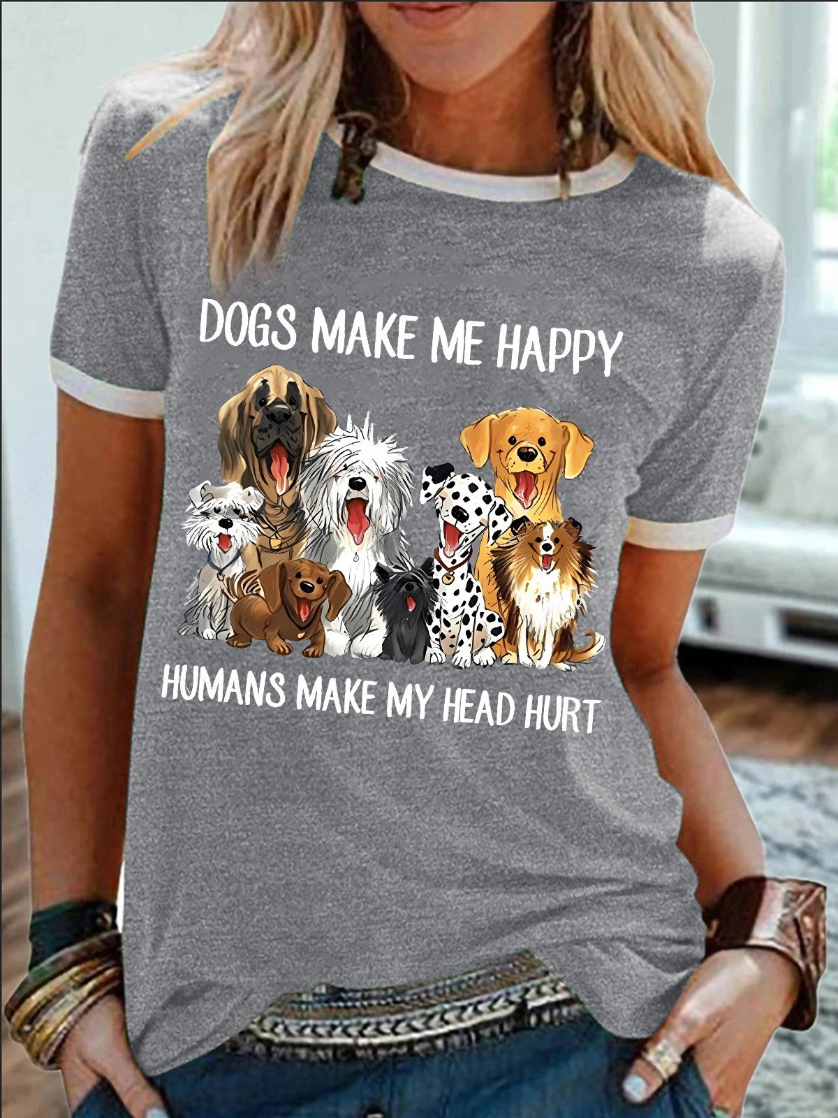 Women's Dog Make Me Happy Humans Make My Head Hurt Funny Graphic Print Cotton-Blend Casual Crew Neck Regular Fit T-Shirt