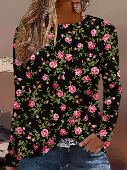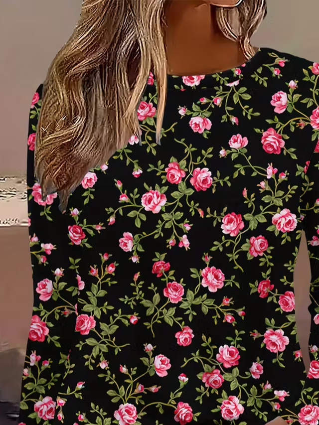 Women's Long Sleeve T-shirt Spring/Fall Black Floral Printing Jersey Crew Neck Daily Going Out Casual Top