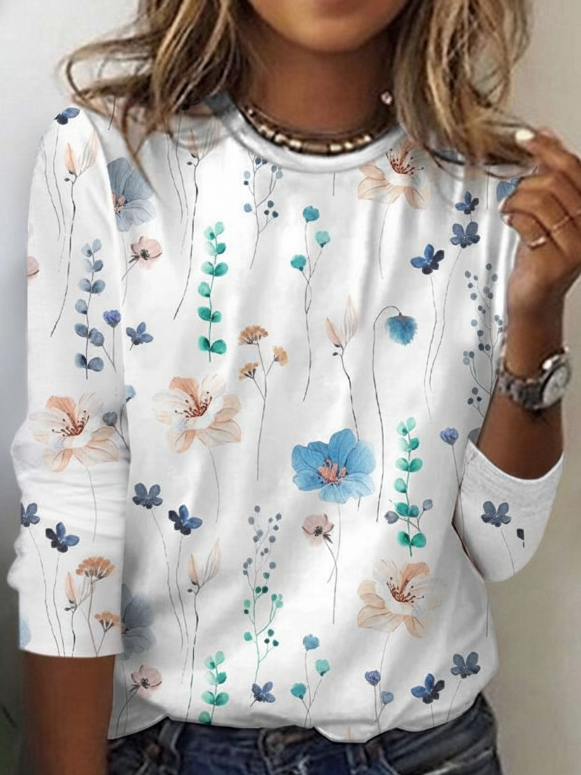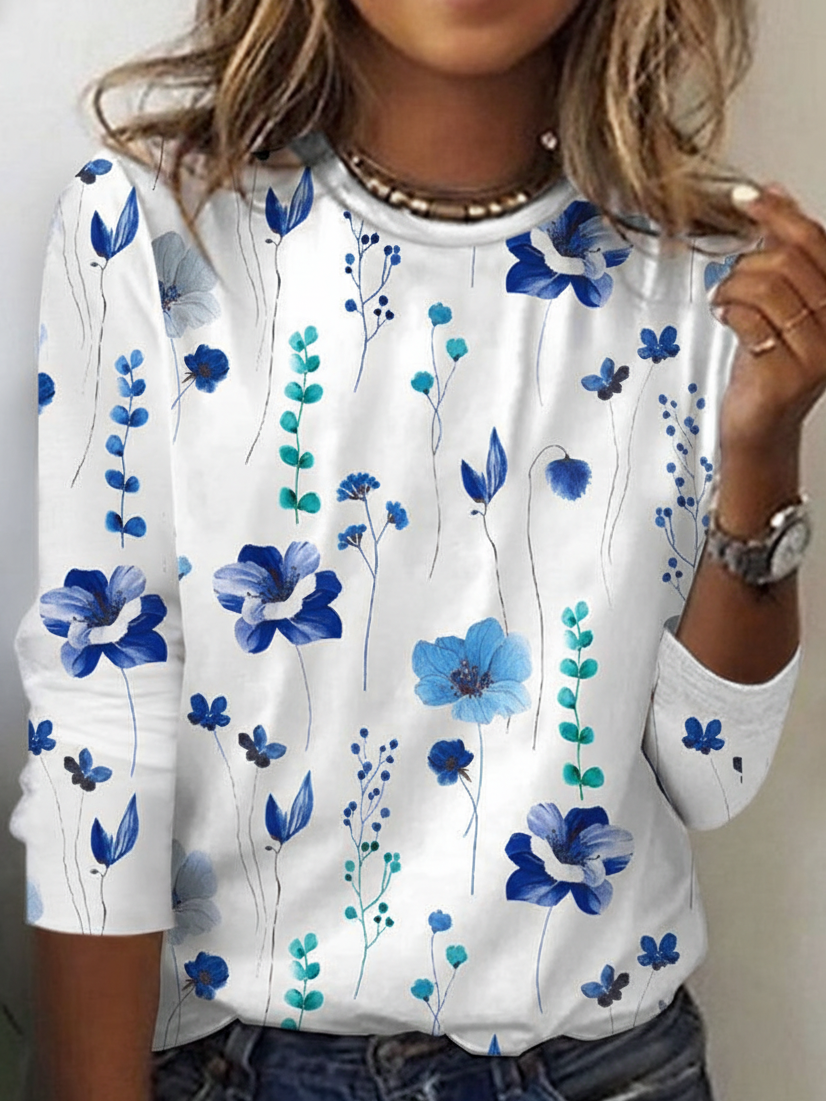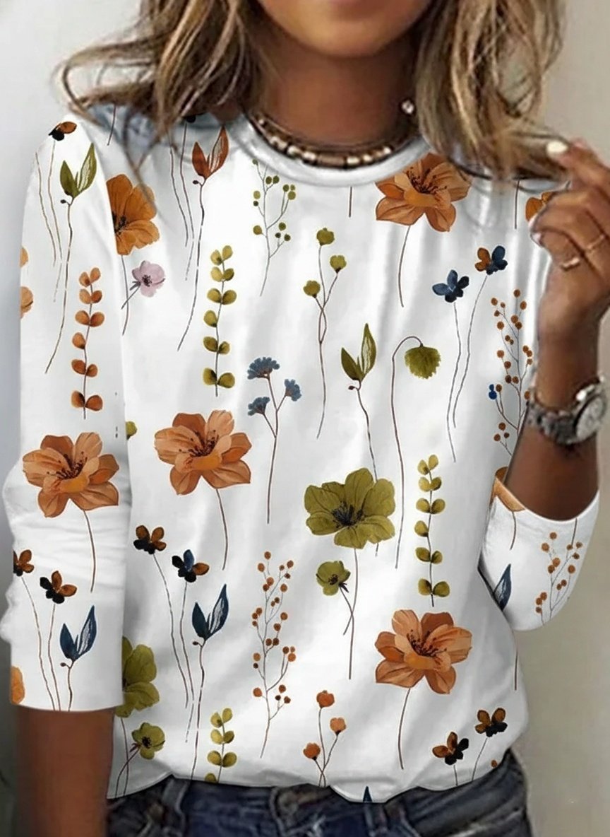 Floral Loose Casual Cotton-Blend T-Shirt