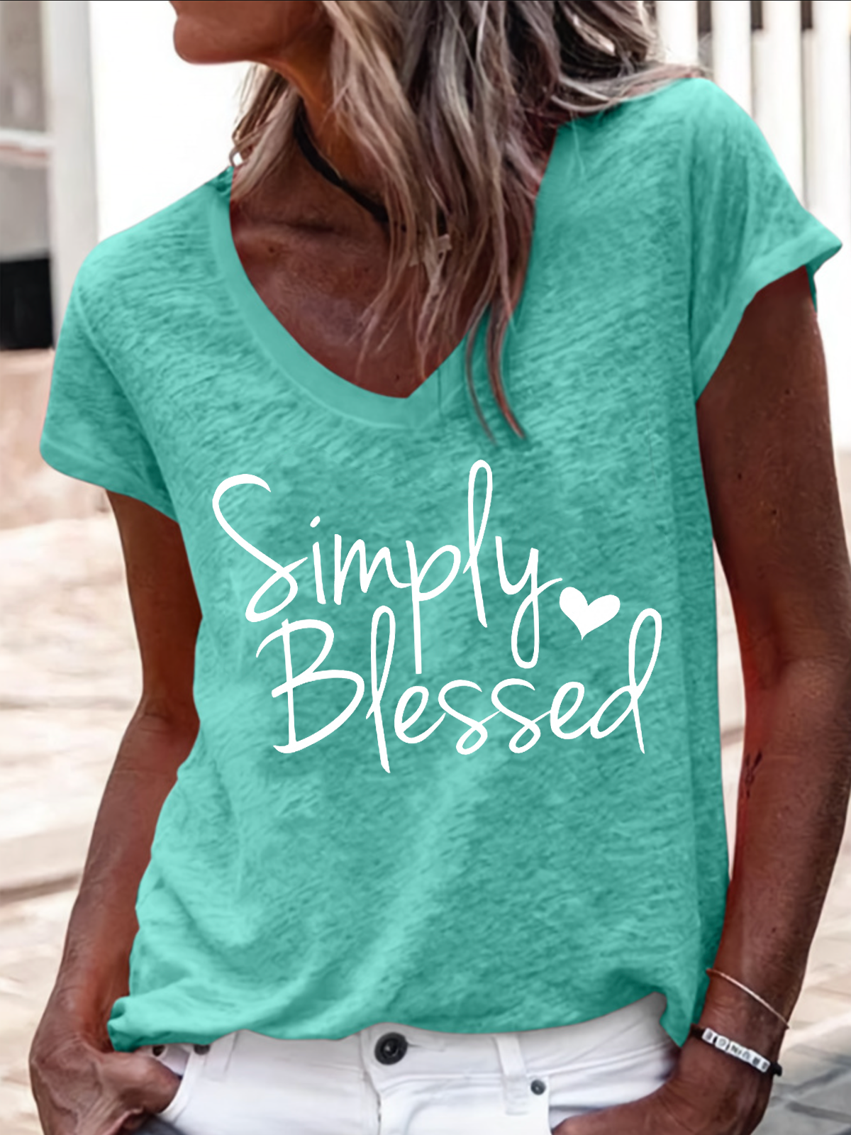Simply Blessed Faith Text Letters Casual V Neck T-Shirt