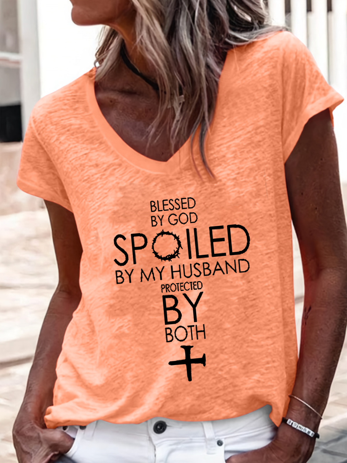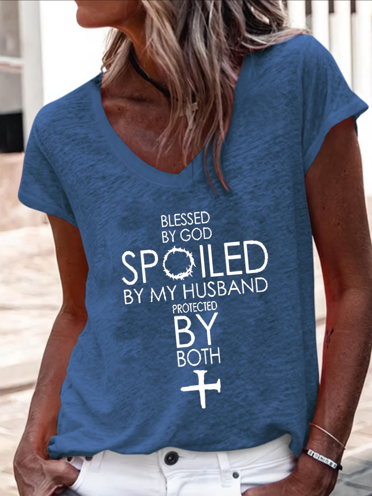 Women's Blessed By God Spoiled By My Husband Protected By Both V-Neck Tee
