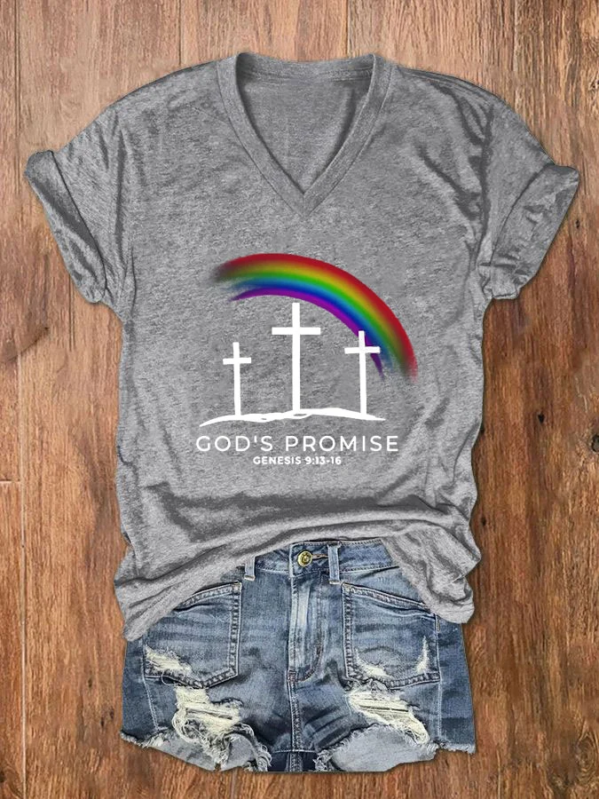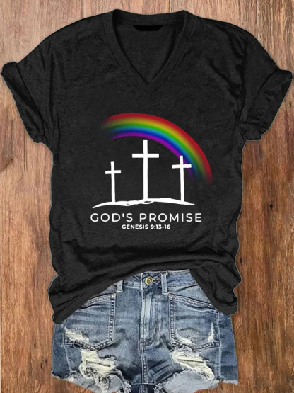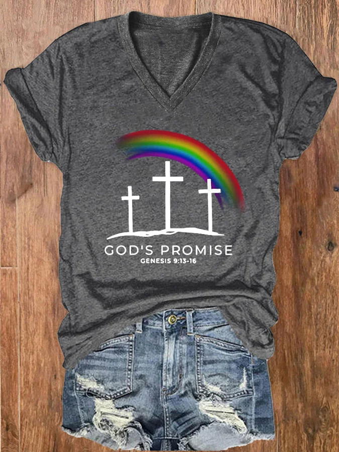 Women's God's Promise Cross Print Text Letters V Neck Casual T-Shirt