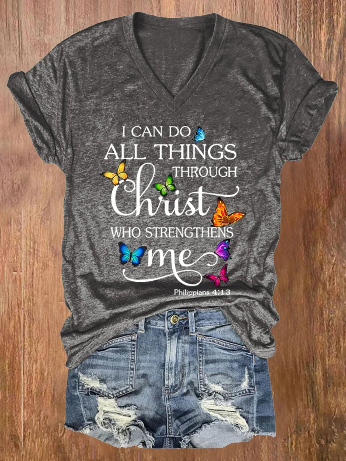 Women's I Can Do All Things Through Christ Who Strengthens Me Print V Neck T-shirt