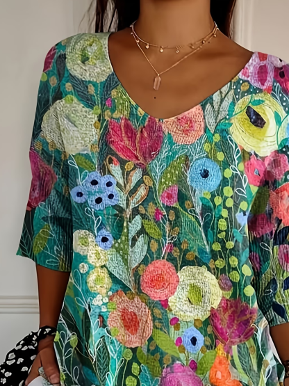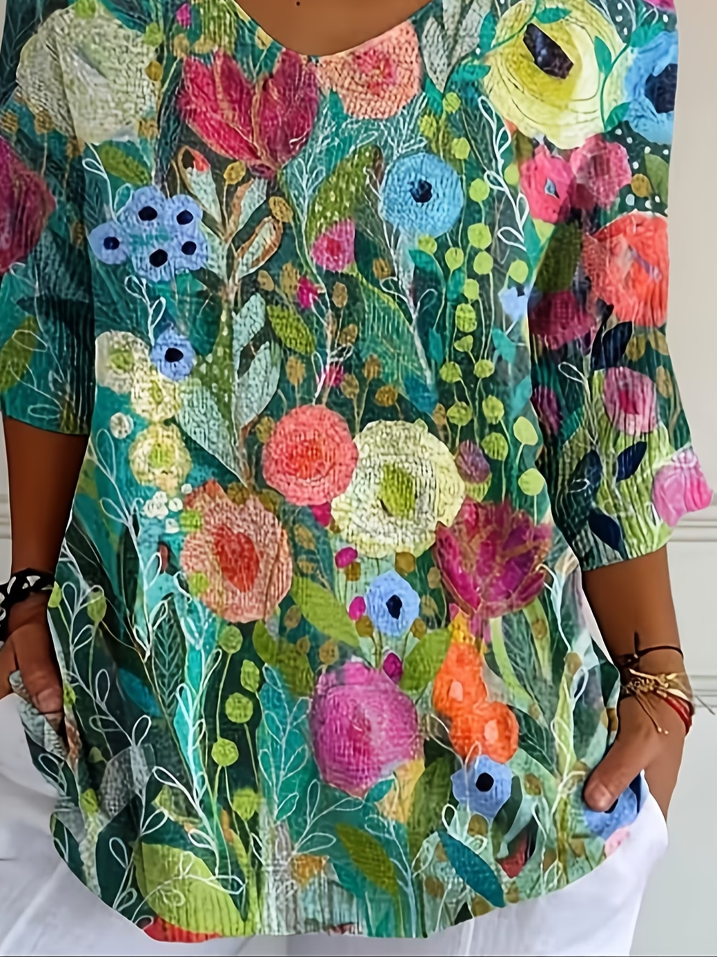 Women's Three Quarter Sleeve T-shirt Spring/Fall Green Floral Printing V Neck Daily Going Out Casual Top