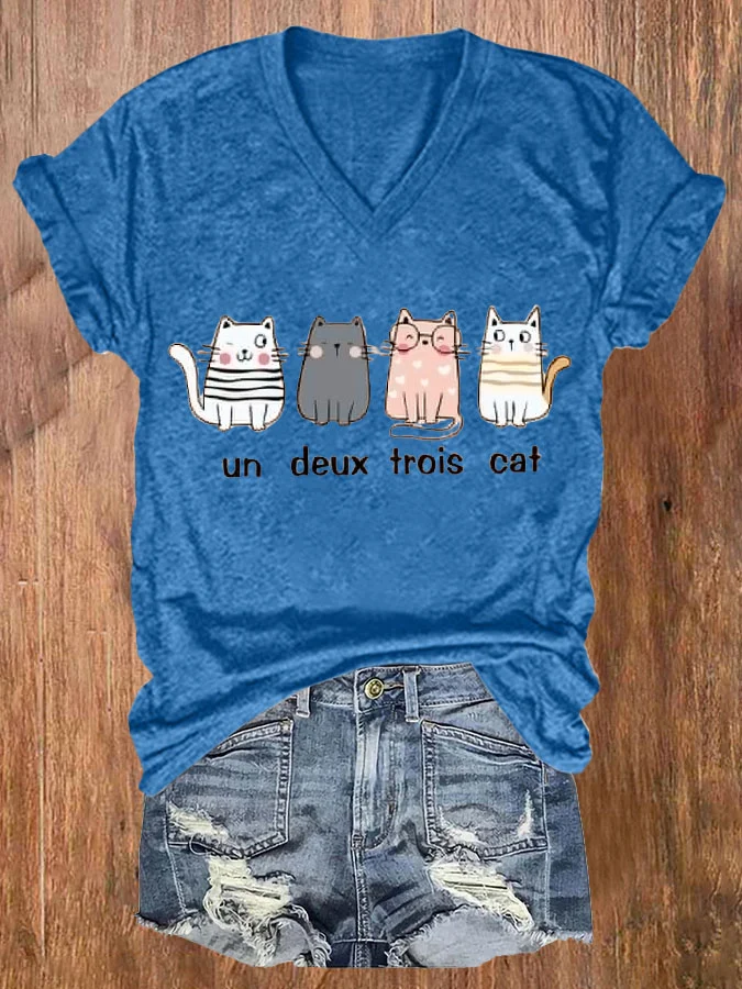 Women's Un Deux Trois Cat Printed Short Sleeve T-Shirt
