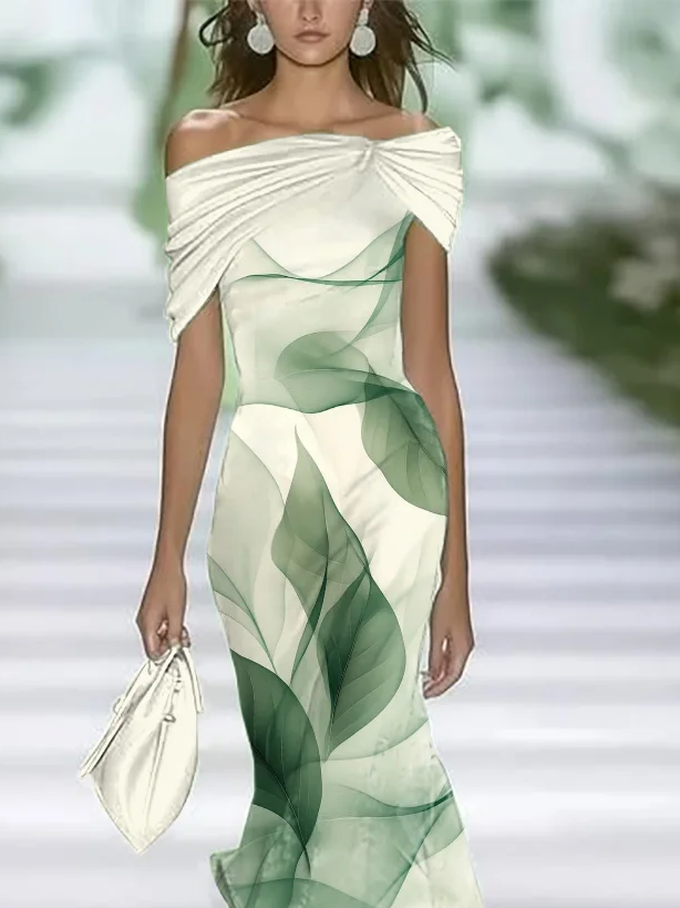 Women's Cap Sleeve Summer Green Leaf Printing Cold Shoulder Daily Going Out Vintage Maxi H-Line Dress