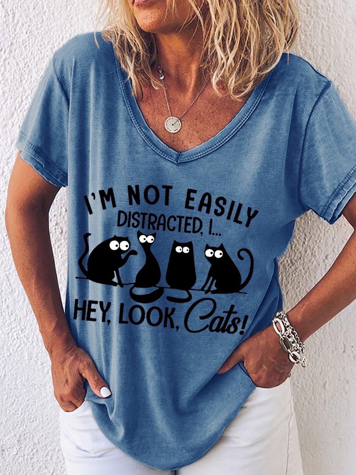 Women's I'm Not Easily Distracted Print Cat Lover V Neck Casual T-Shirt