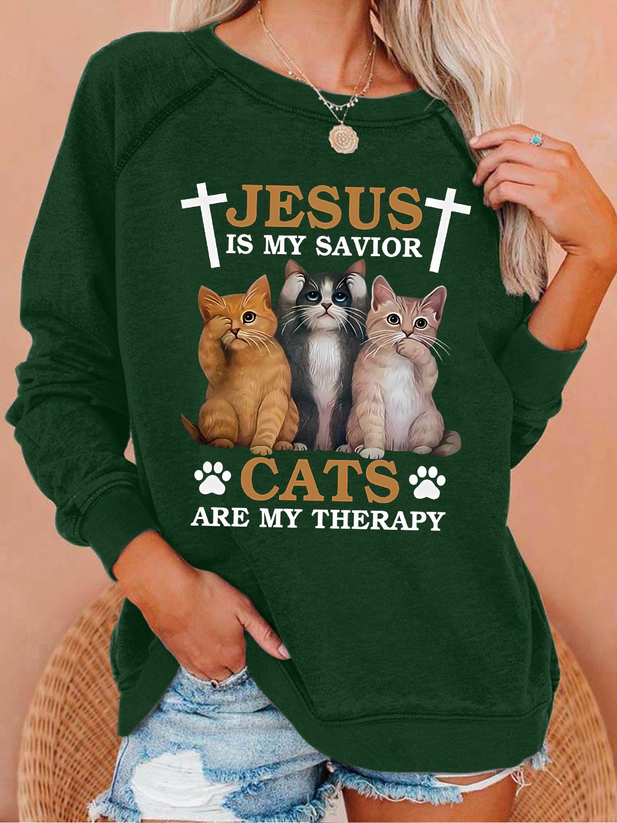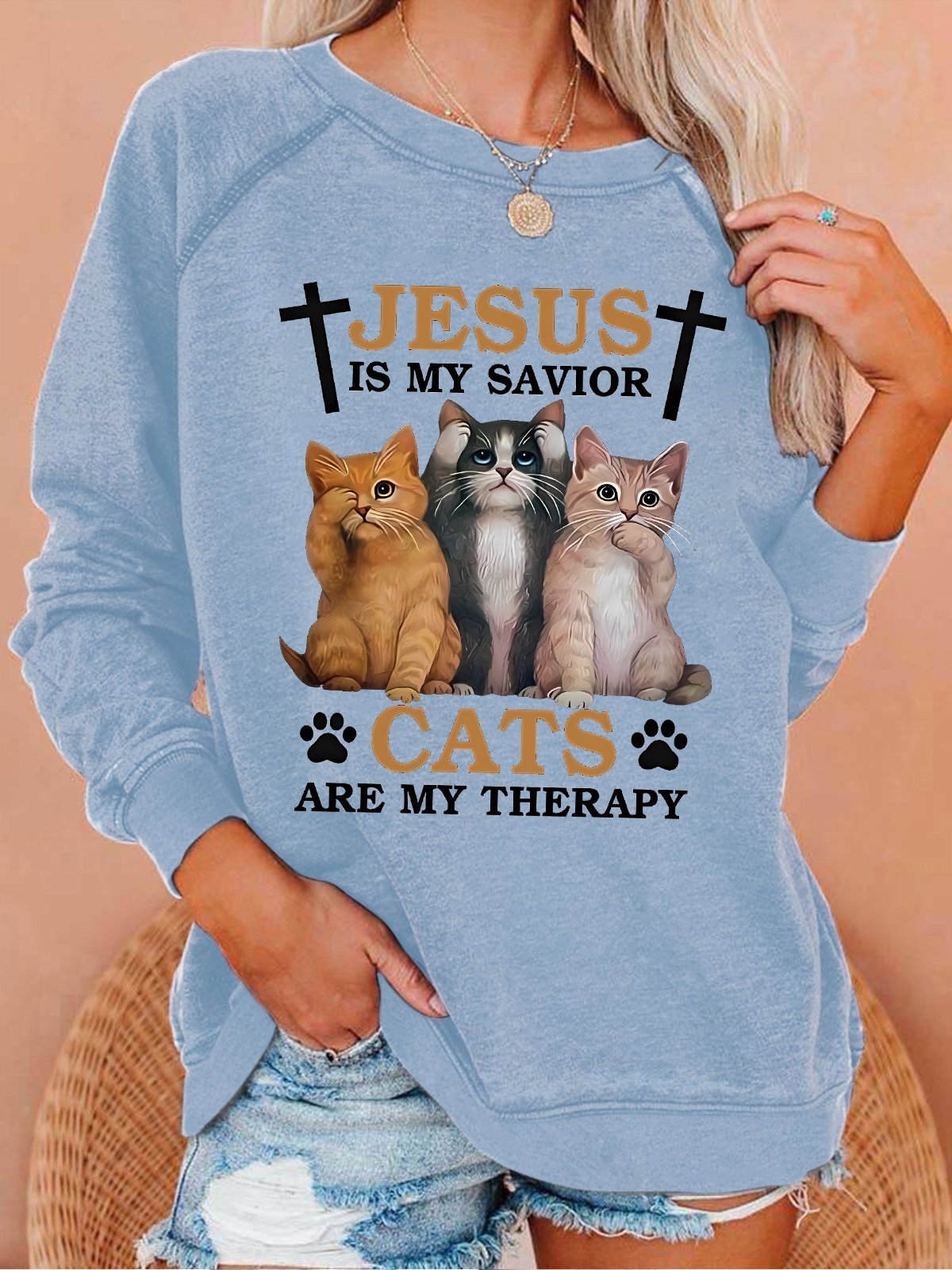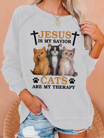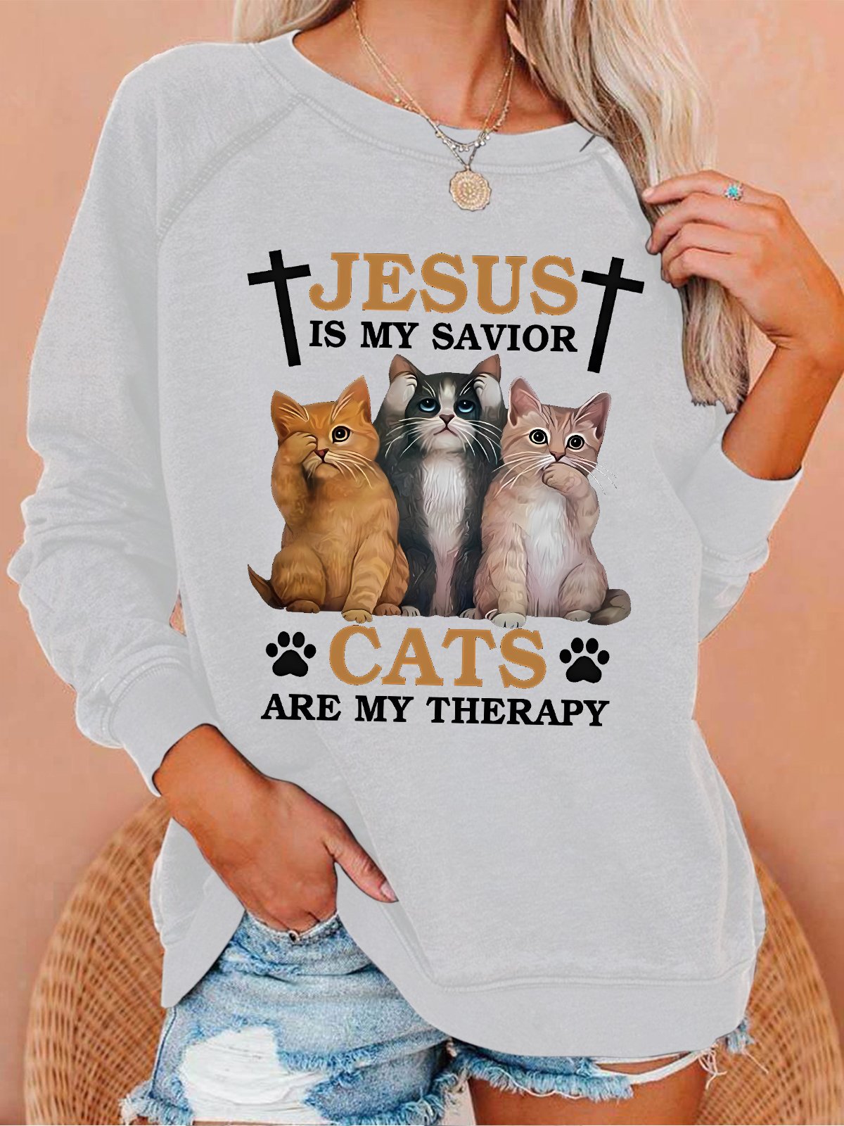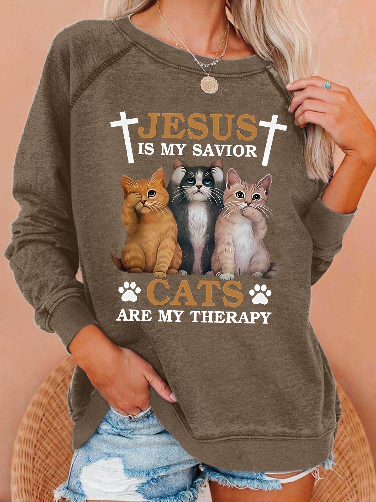 Women's Funny Jesus Is My Savior Cats Are My Therapy Cat Graphic Graphic Text Letters Sweatshirt