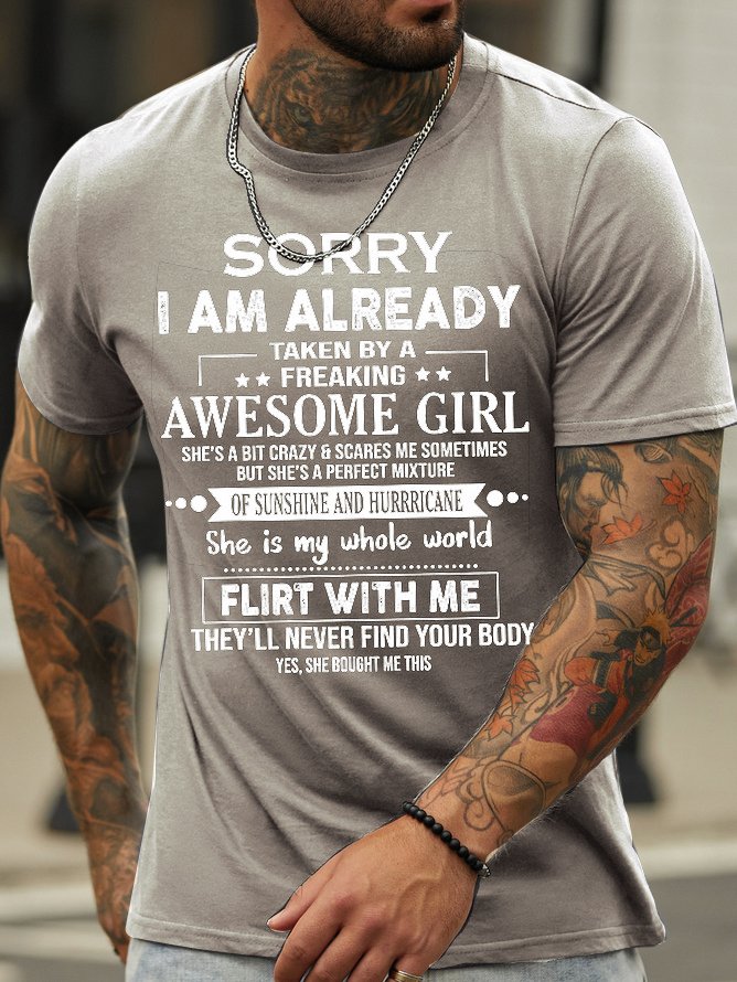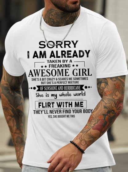 Men's Sorry I Am Already Taken A Freaking Awesome Girlsorry I Am Already Taken A Freaking Awesome Girl Funny Graphic Printing Cotton Text Letters Loose Casual T-Shirt