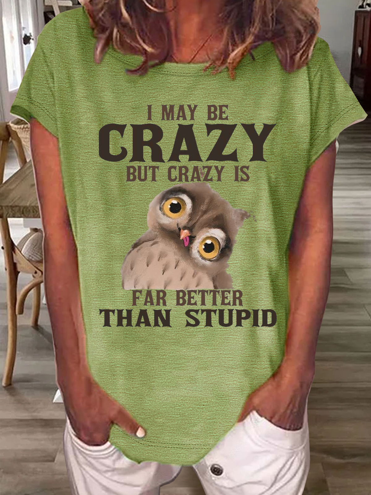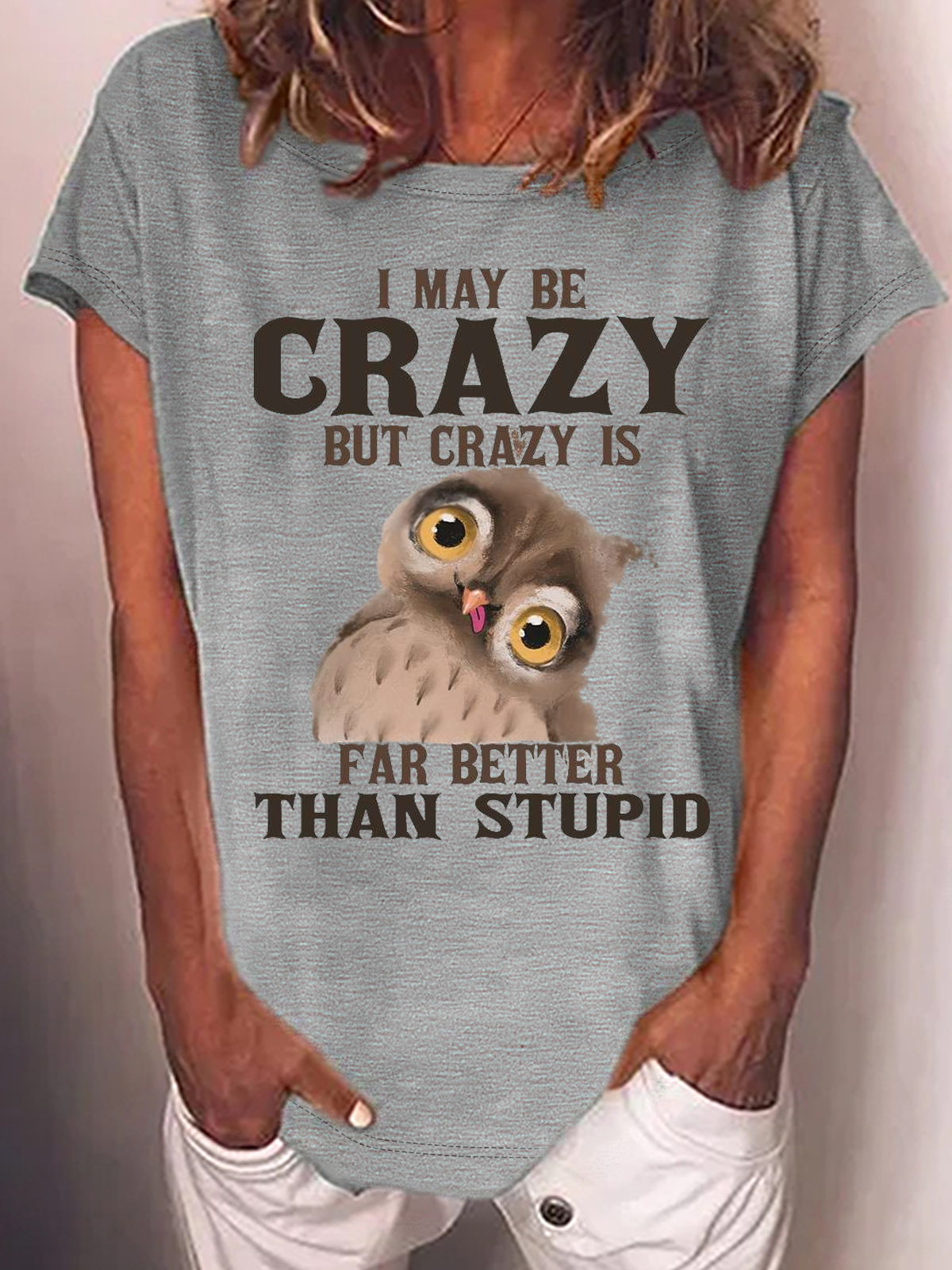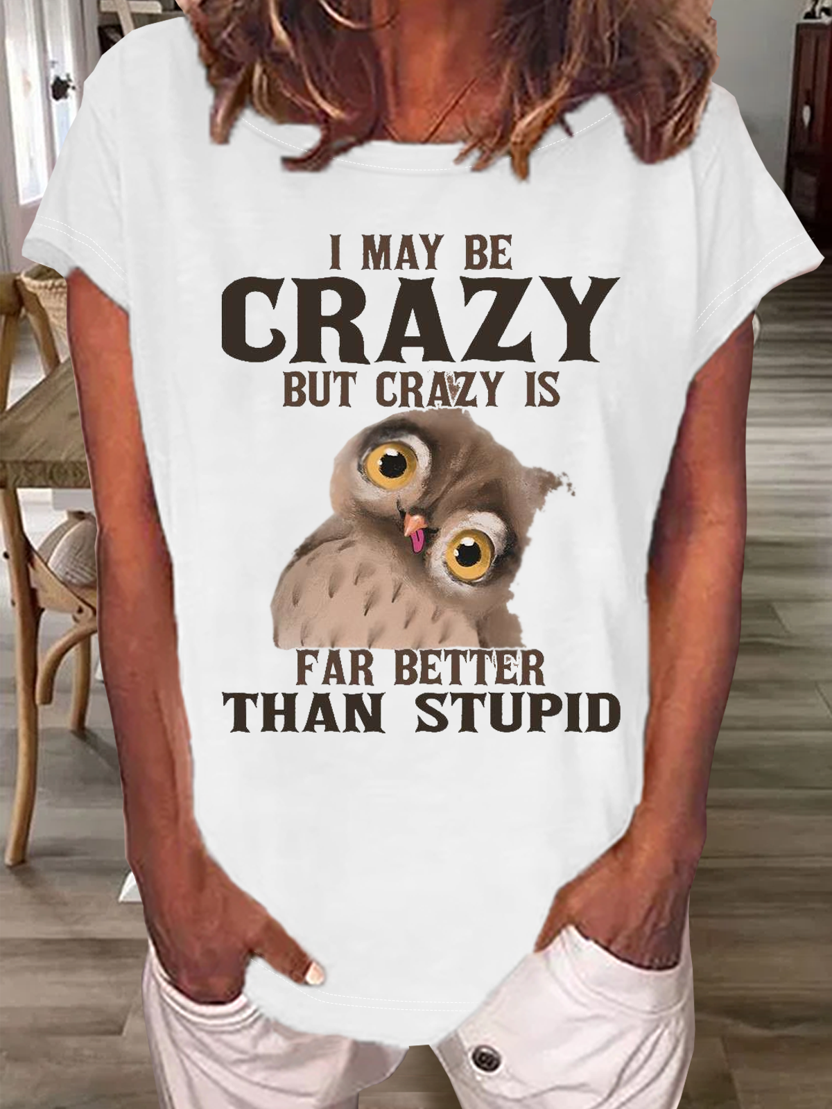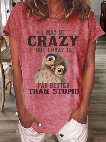 Women's Funny I May Be Crazy But Crazy Is Far Better Than Stupid Crazy Owl Casual Crew Neck T-Shirt