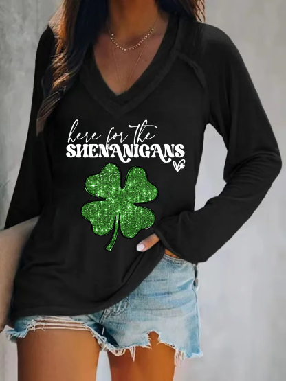 Cotton V Neck Four-Leaf Clover Casual T-Shirt