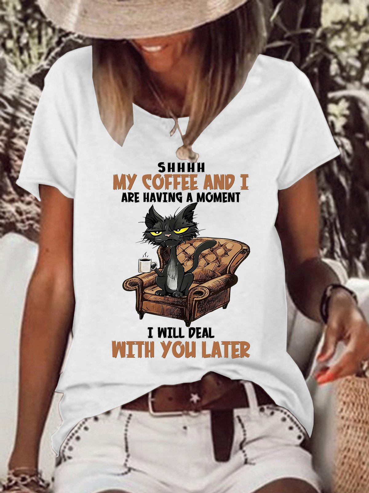Women Funny Cat Coffee Cotton-Blend Loose Crew Neck T-Shirt