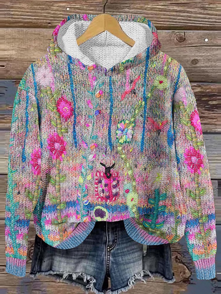 Vintage floral art knitted hooded sweater
