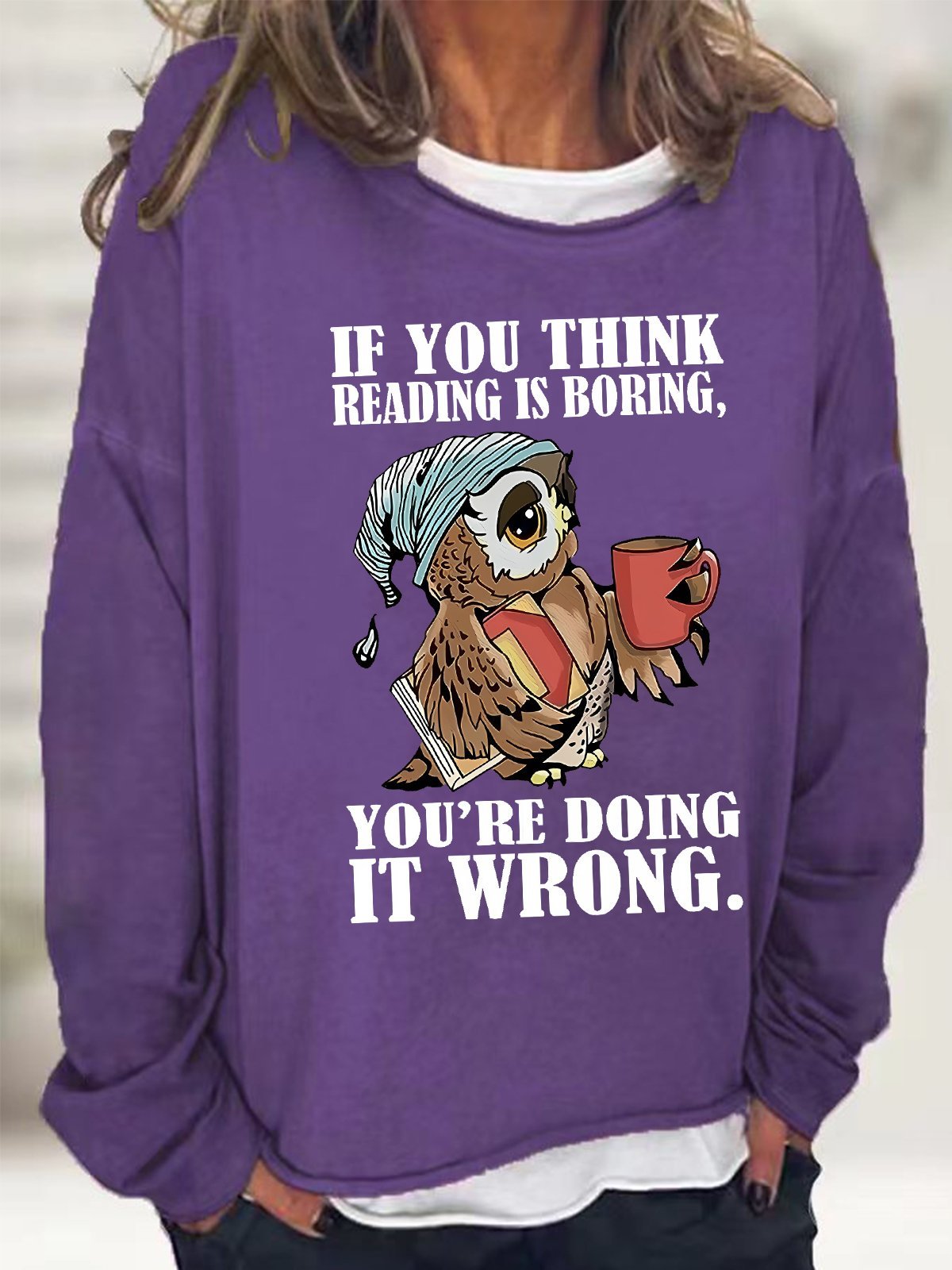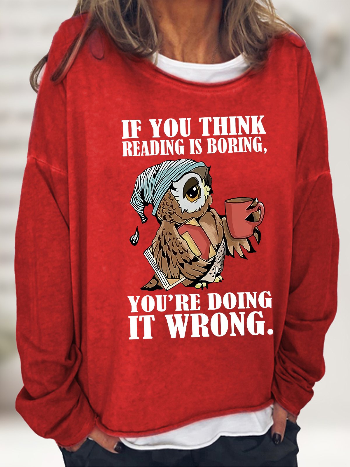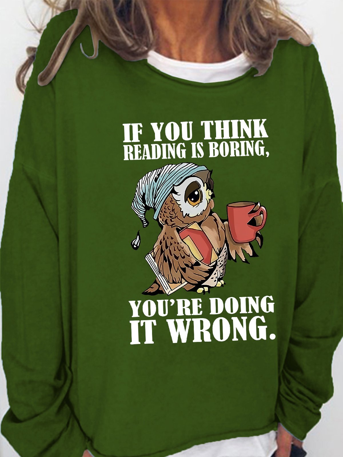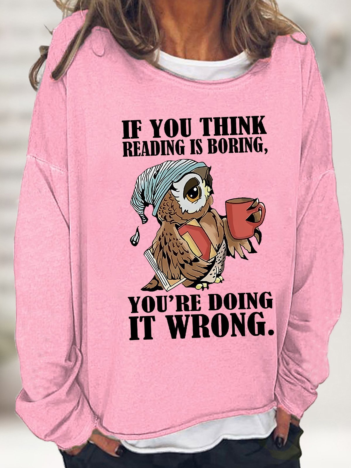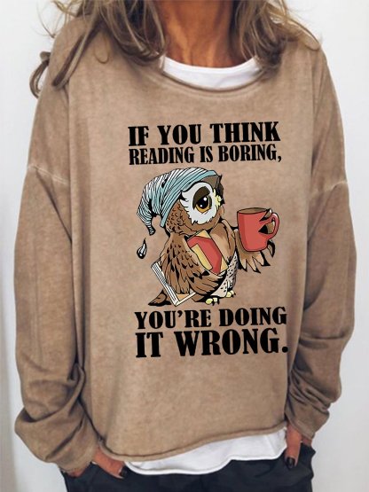 Women's Funny If You Think Reading Is Boring Owl Graphic Text Letters Casual Sweatshirt