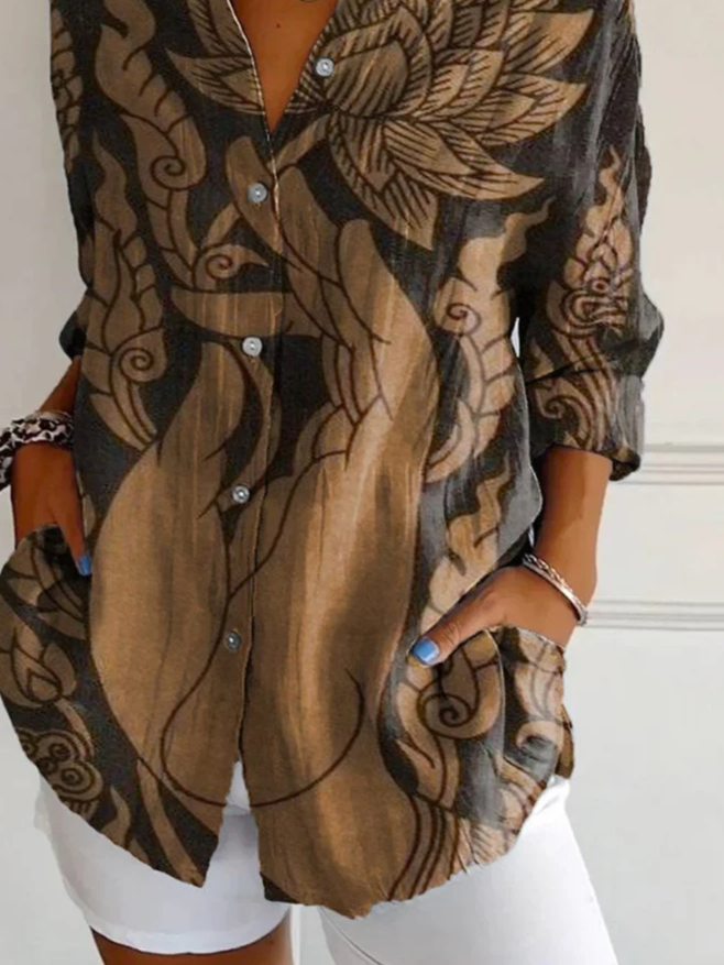 Women's Long Sleeve Shirt Spring/Fall Brown Floral Buckle Shirt Collar Daily Going Out Casual Top