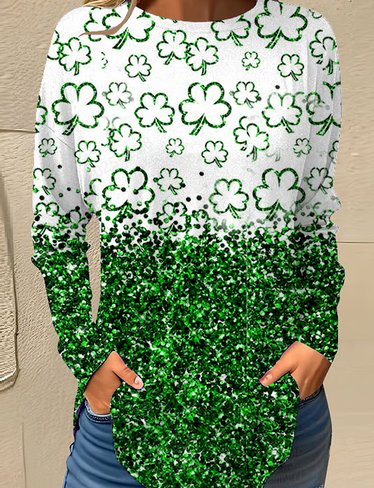 Women's St. Patrick's Day Glitter Clover Printed Top Long sleeve Shirt