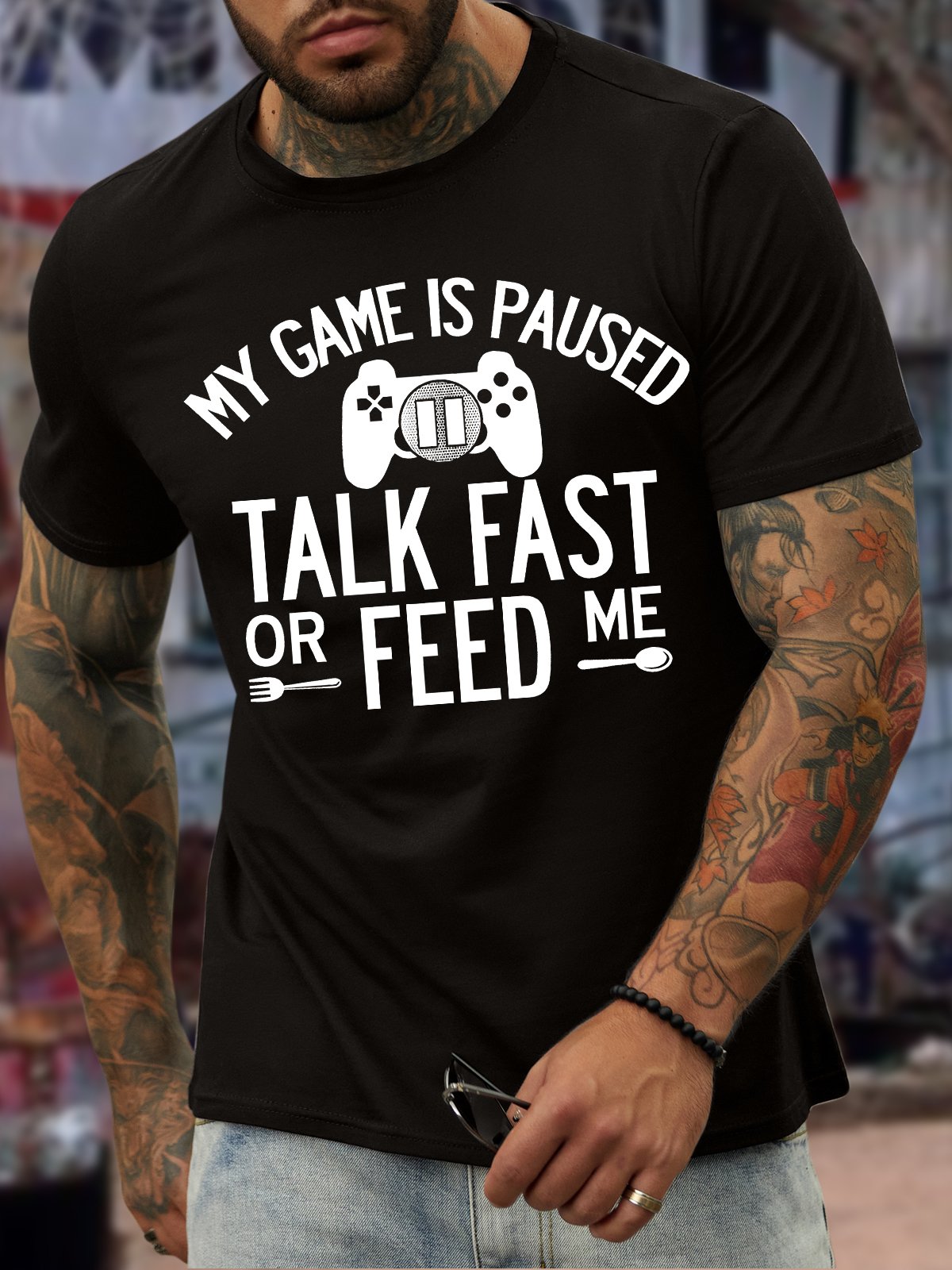 Men's My Game Is Paused Talk Fast Or Feed Me Funny Graphic Print Casual Text Letters Cotton T-Shirt
