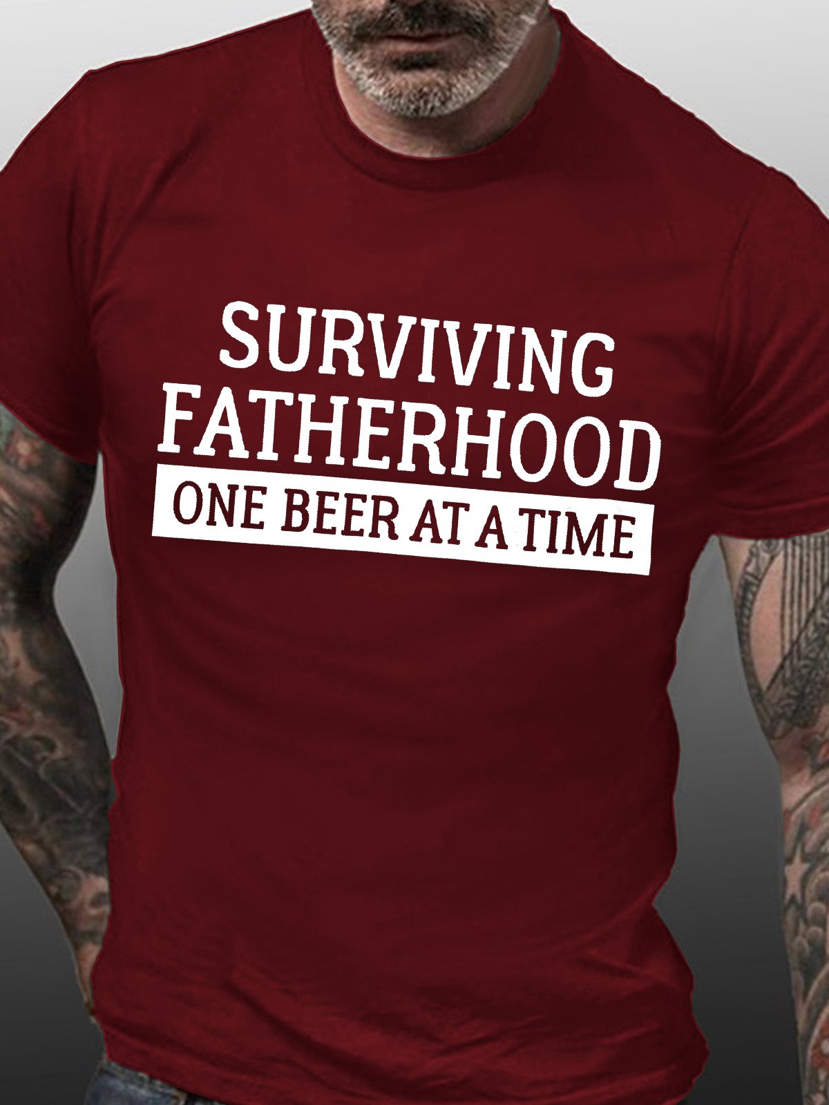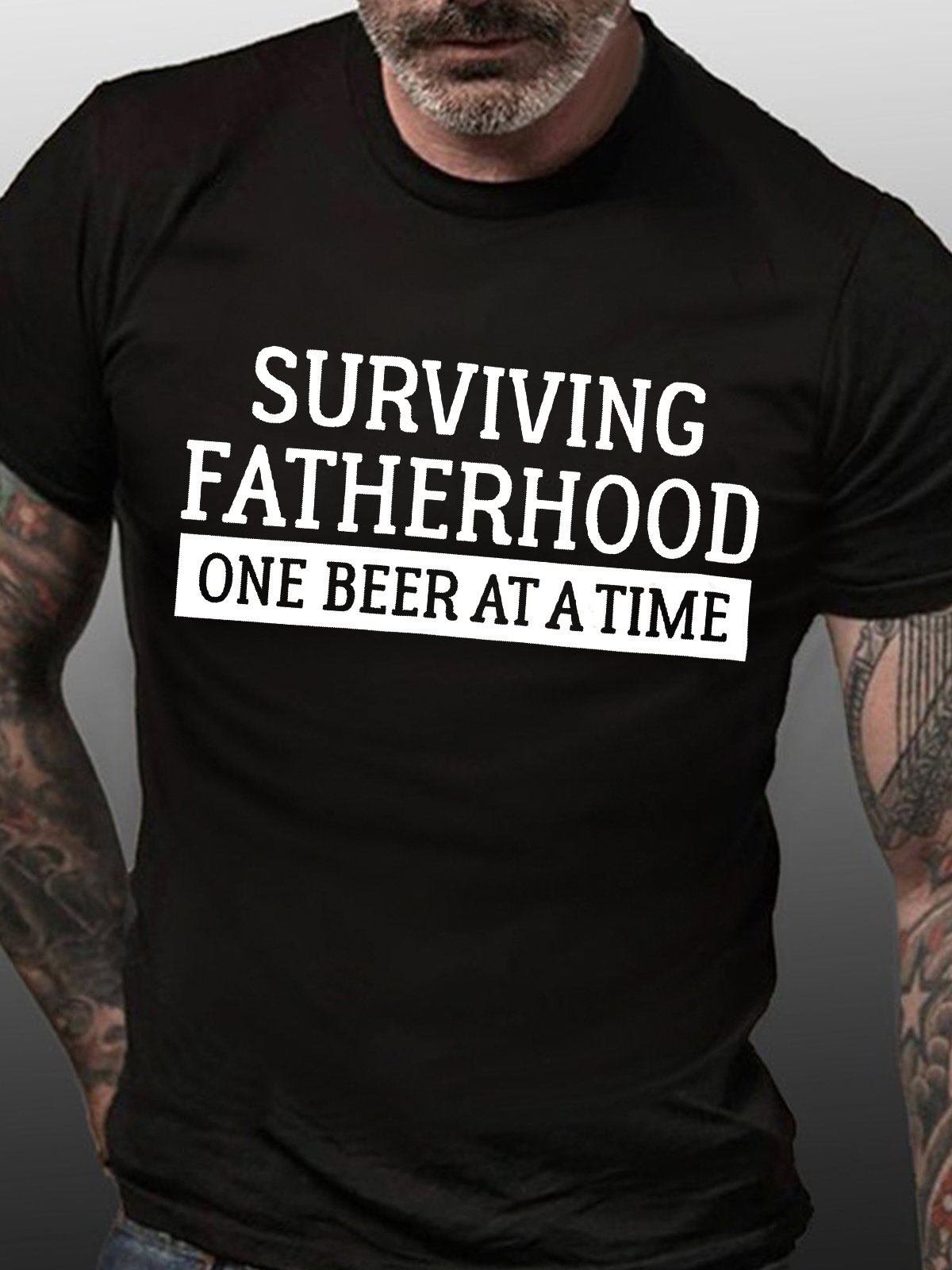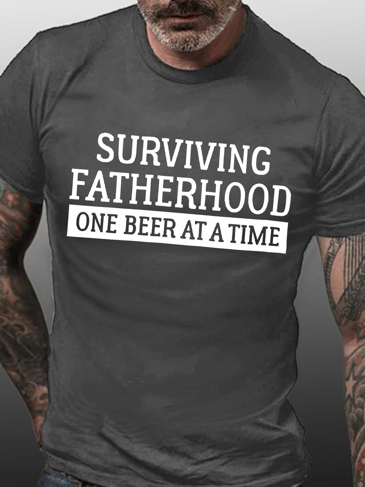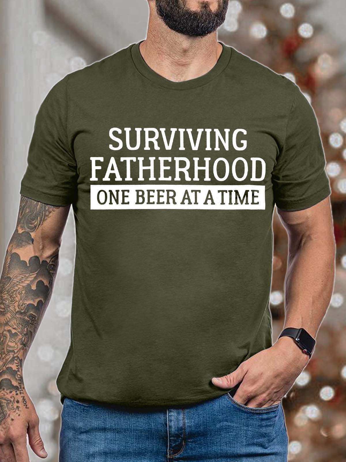 Men's Surviving Fatherhood One Beer At A Time Funny Graphic Print Text Letters Cotton Casual Crew Neck T-Shirt