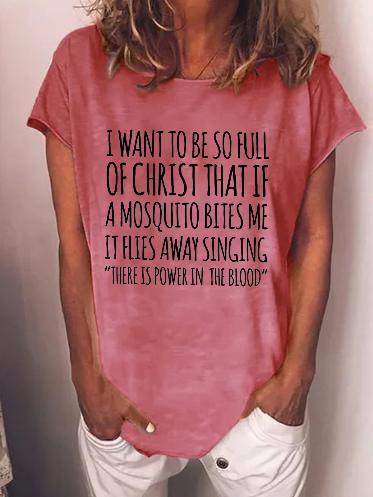 Women's I Want To Be So Full Of Christ That If A Mosquito Bites Me It Flies Away Singing Funny Text Letters Loose Casual T-Shirt