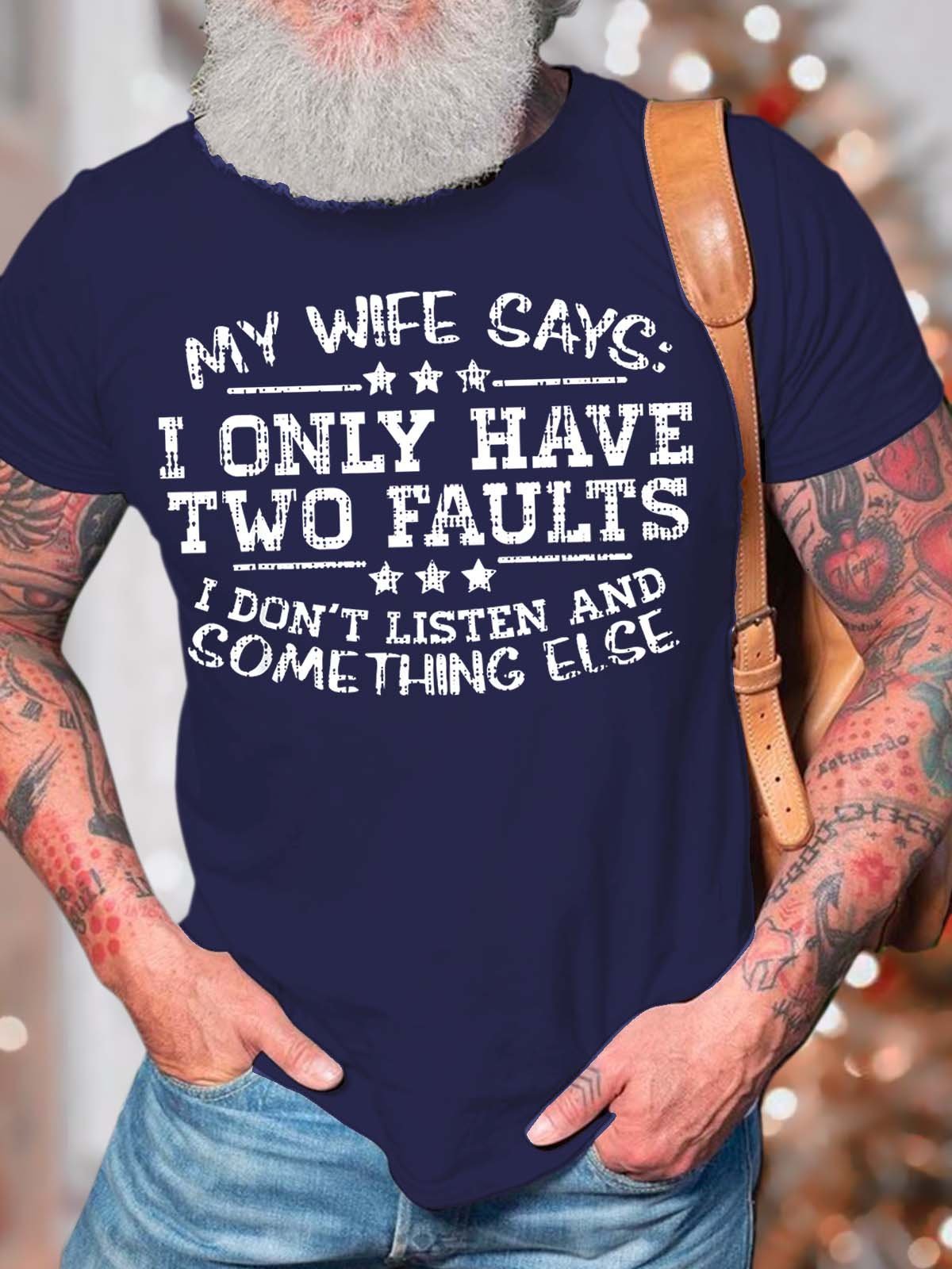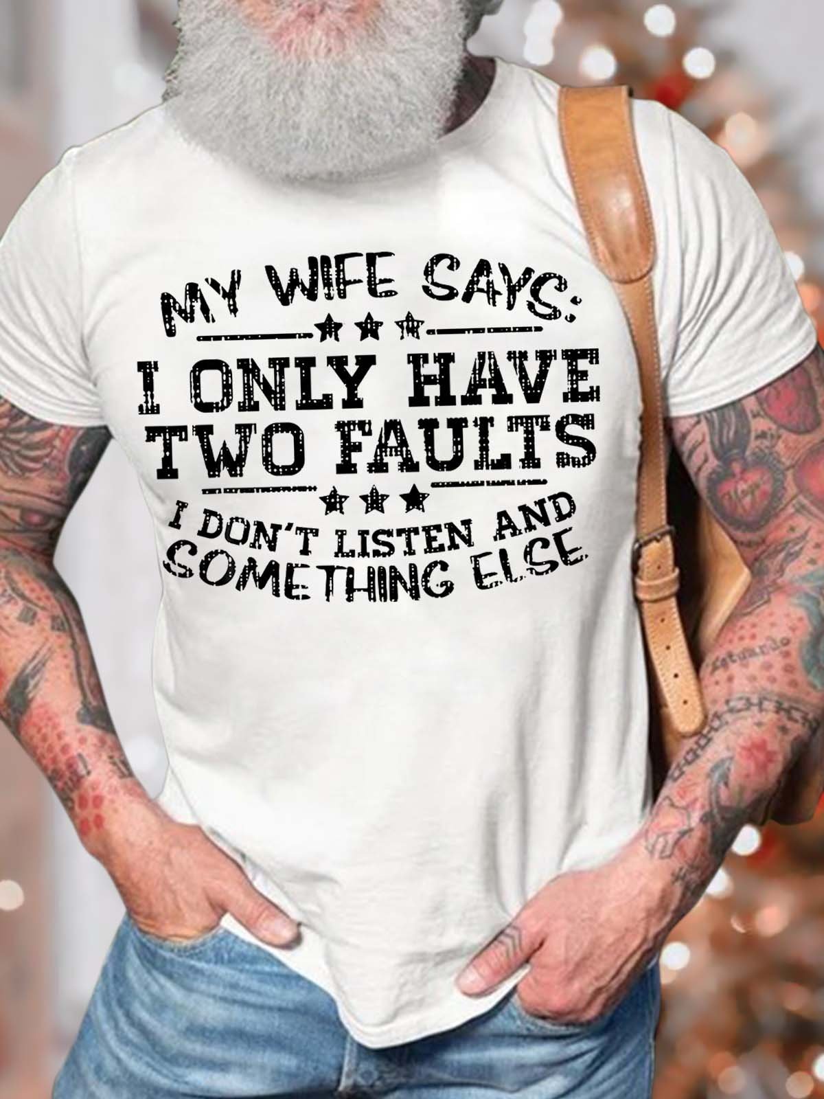 Men’s My Wife Says I Only Have Two Faults I Don’t Listen And Something Else Crew Neck Text Letters Casual Cotton T-Shirt