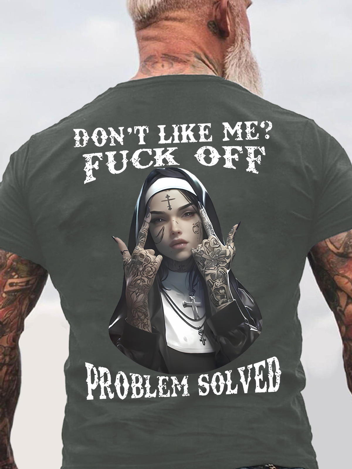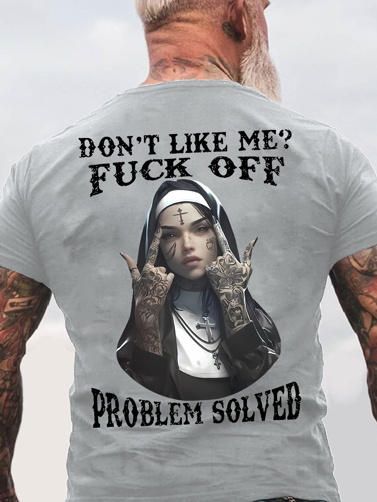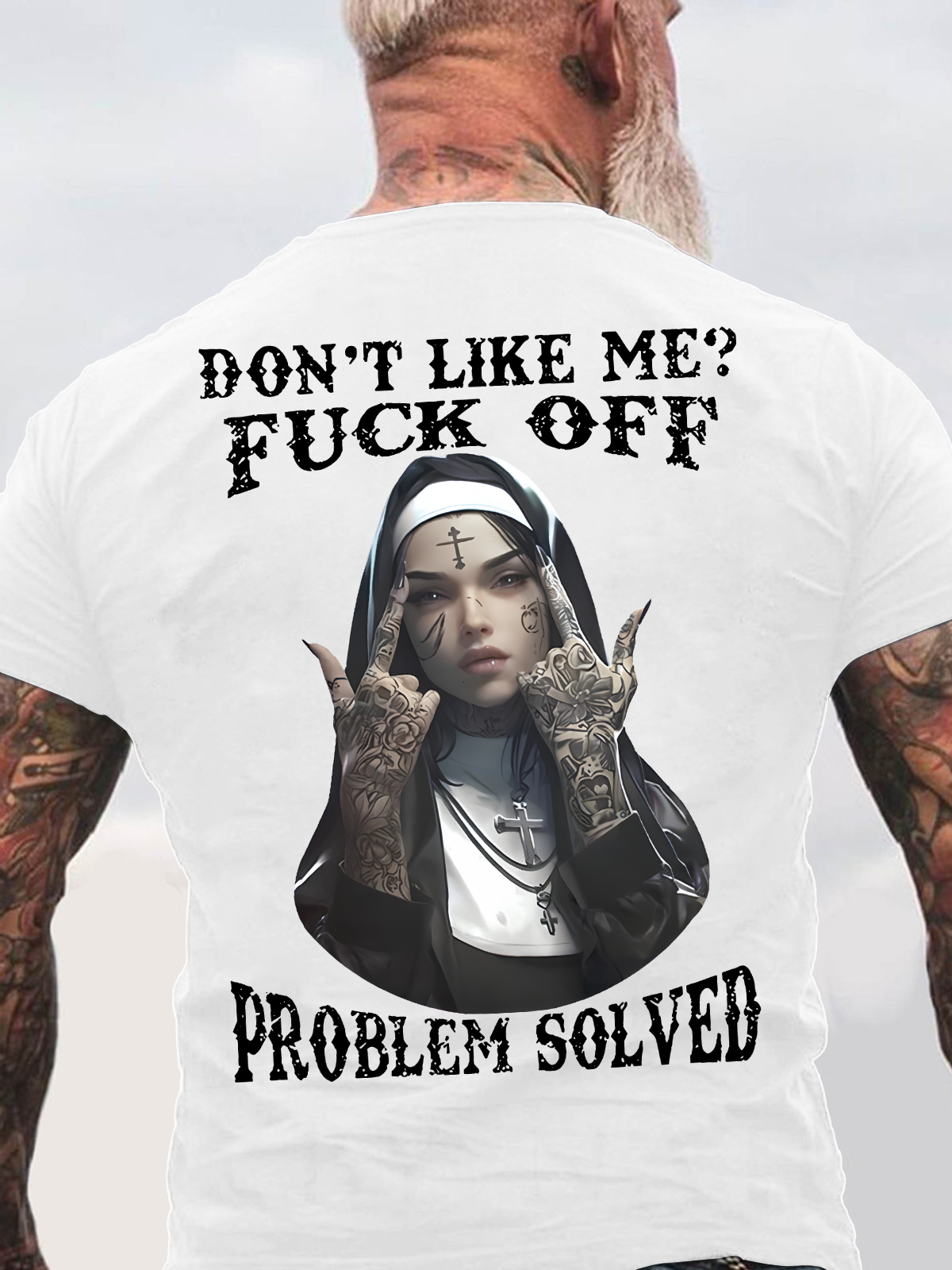 Don't Like Me Fuck Off Defiant Nun Print Men's Back Cotton T-Shirt
