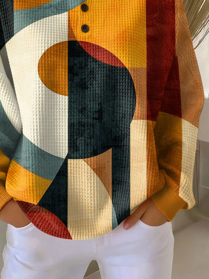 Women's Abstract Print Button-Up Casual Waffle Knit Sweatshirt