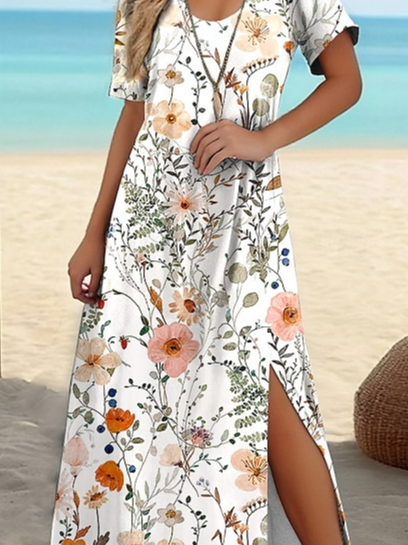 Women's Artistic Floral Print Slit Long Dress
