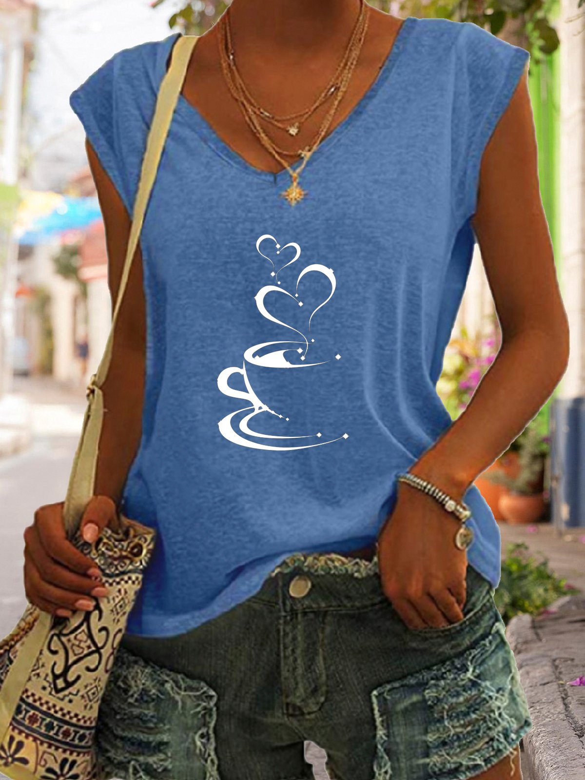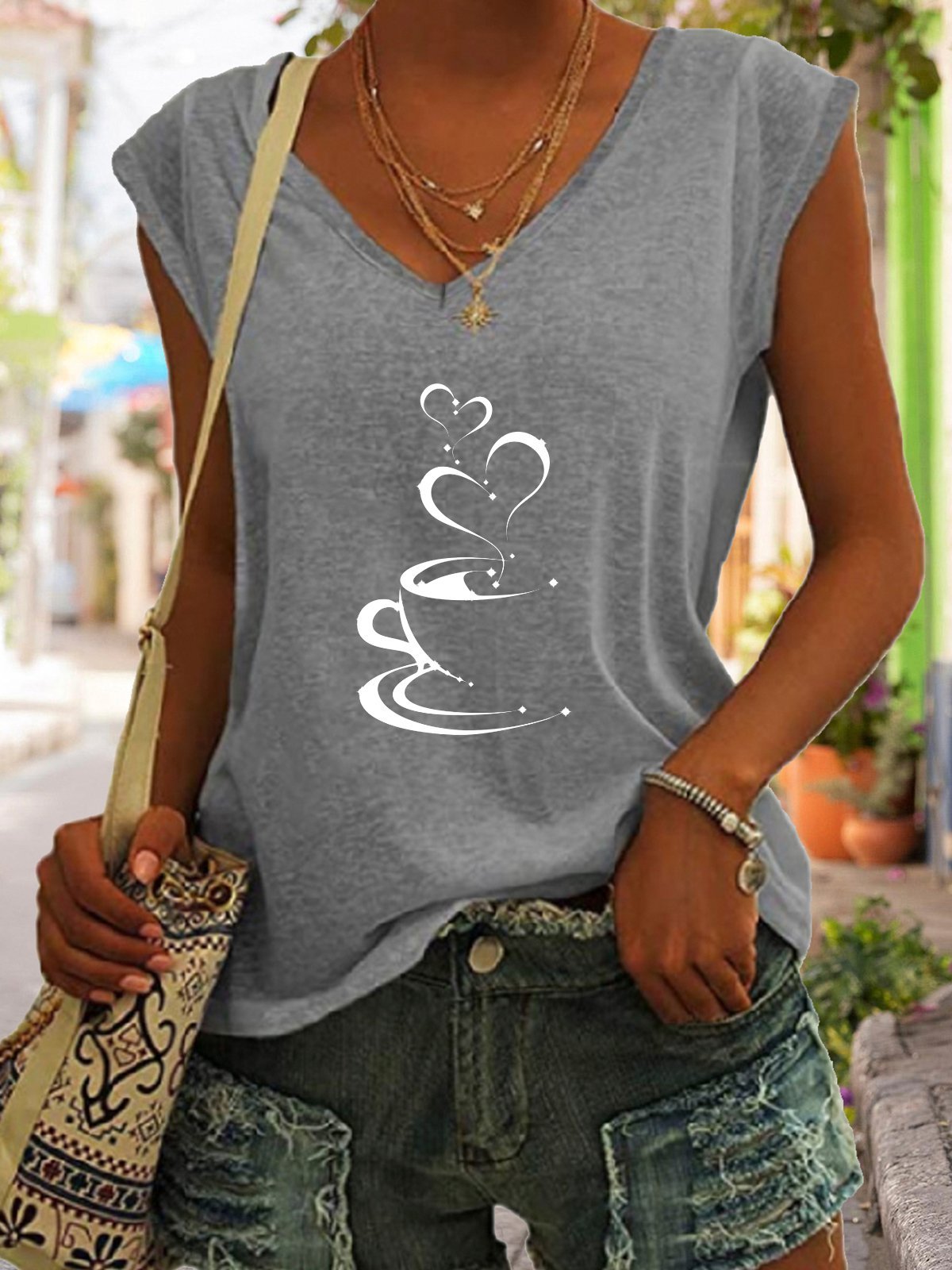 Coffee Heart Print V-Neck Top