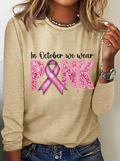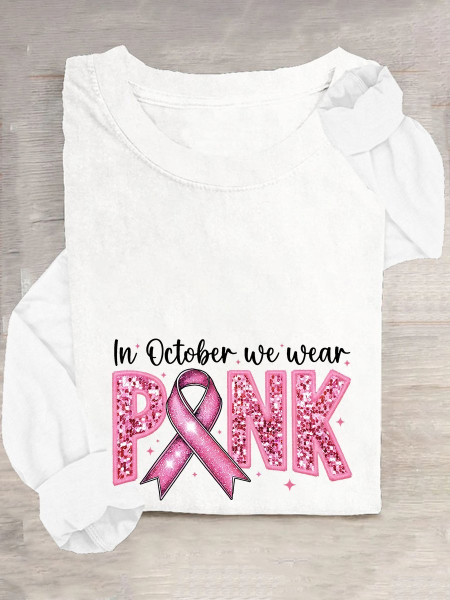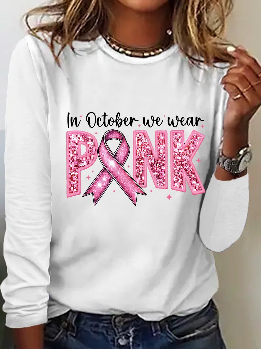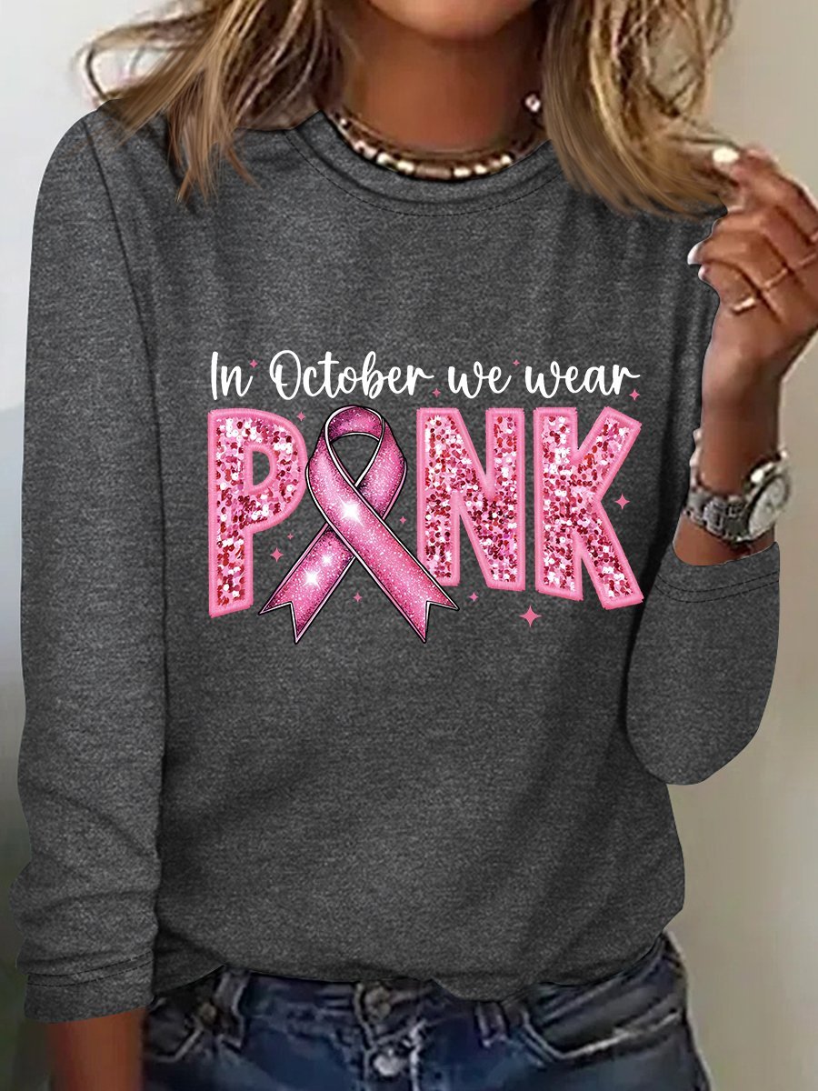In October We Wear Pink Embroidery Breast Cancer Awareness Casual Long Sleeve Shirt