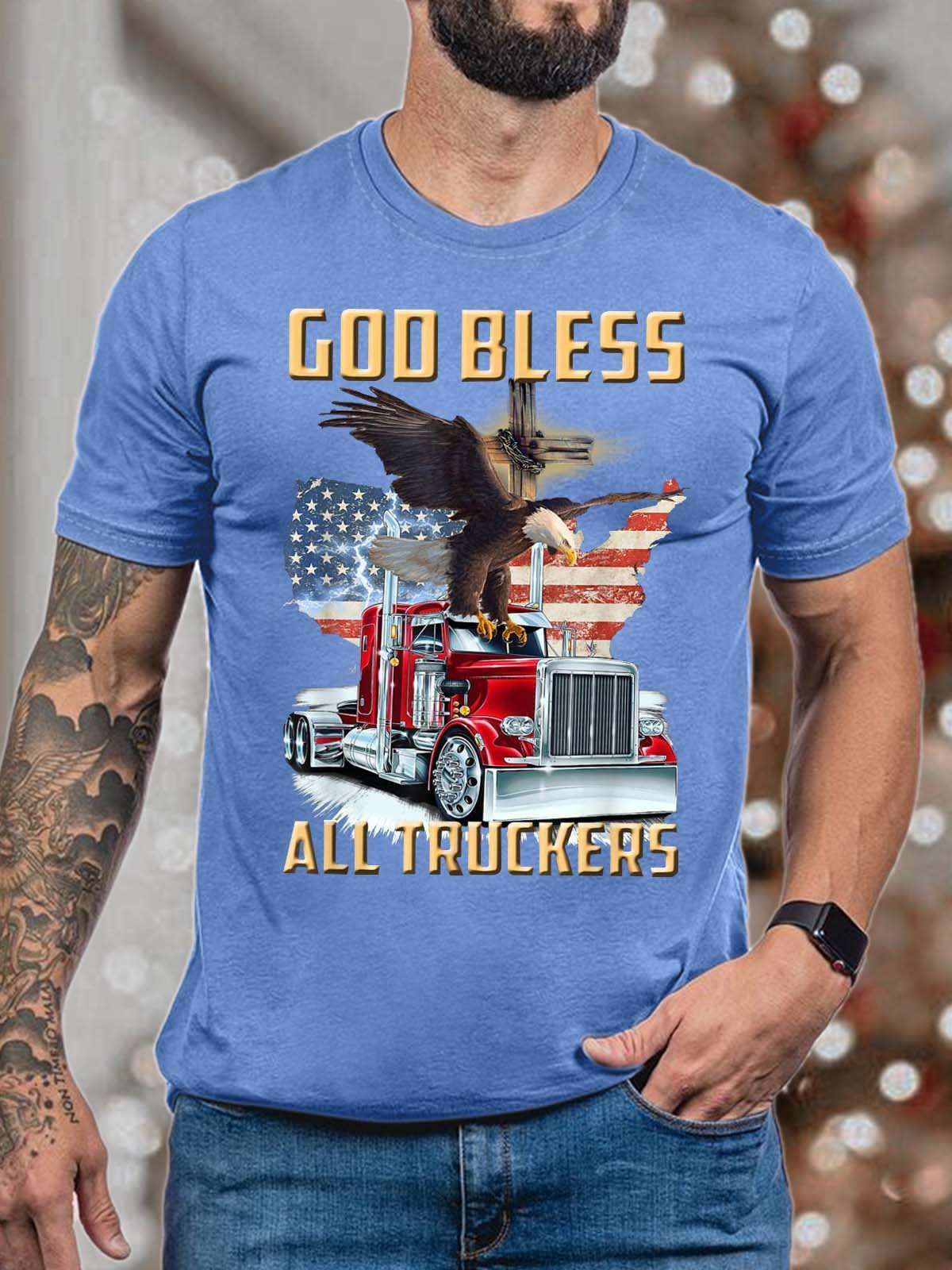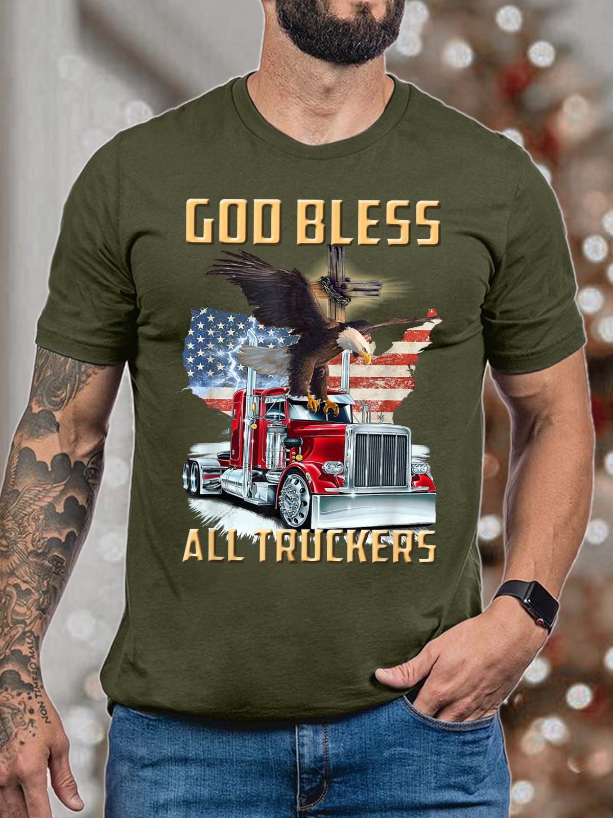 Men God Bless All Truckers American Flag Eagles Casual T-Shirt