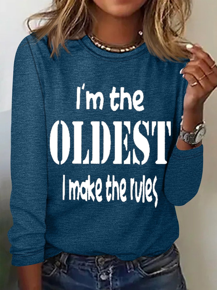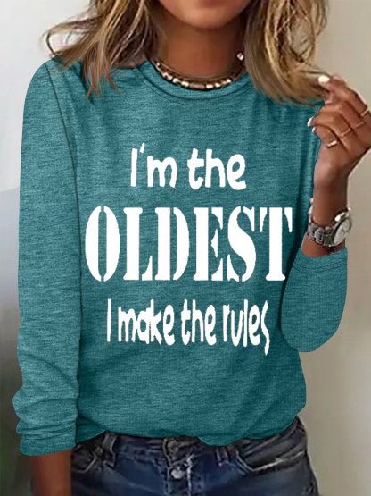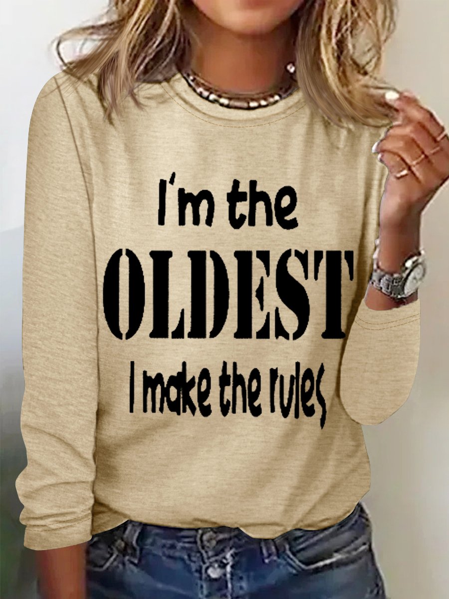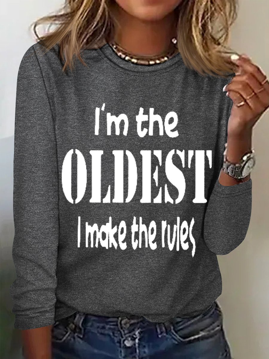 Women's Funny Word I'm The Oldest Crew Neck Cotton-Blend Text Letters Long Sleeve Top