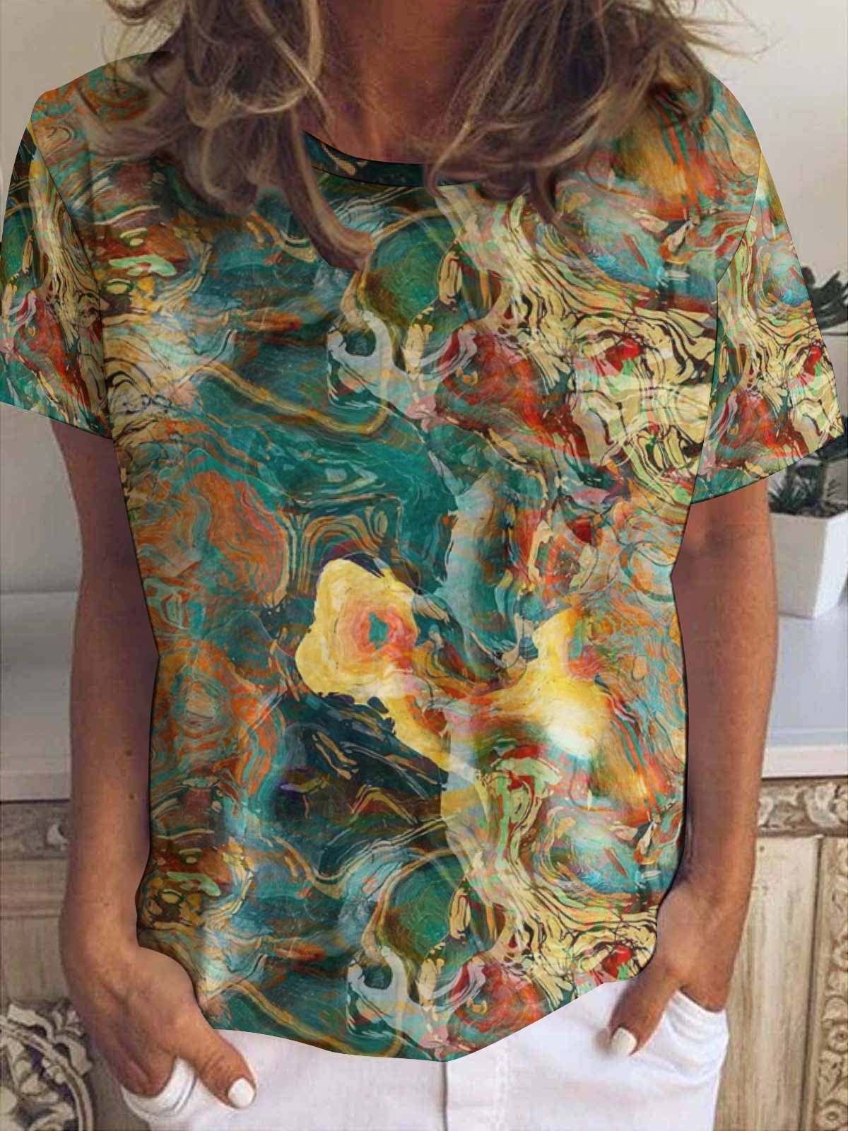 Women Abstract Rendering Painting Prints Simple Crew Neck T-Shirt