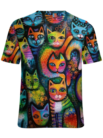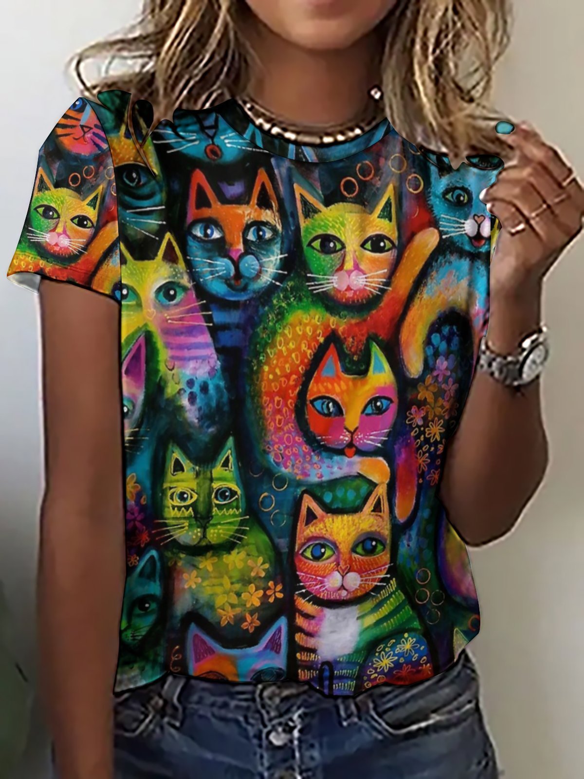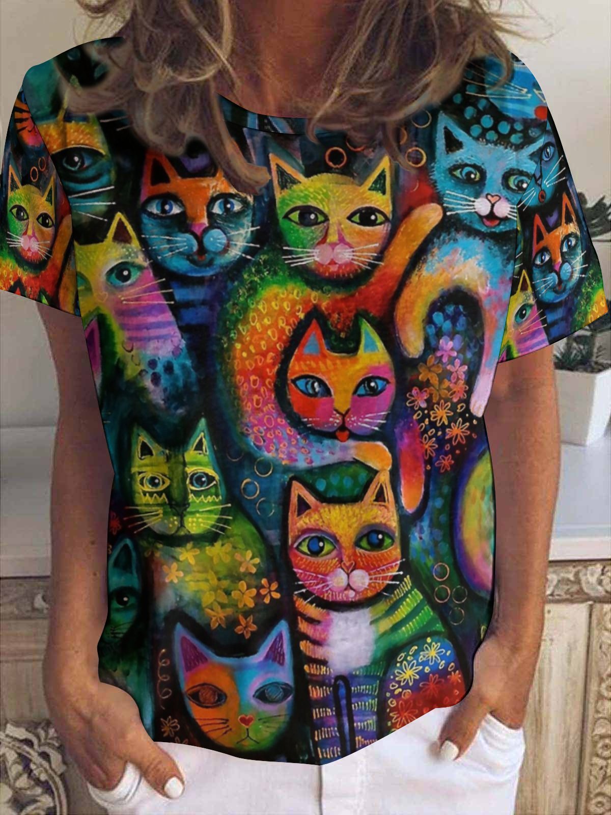 Abstract Colorful Cat Crew Neck Cat Loose T-Shirt