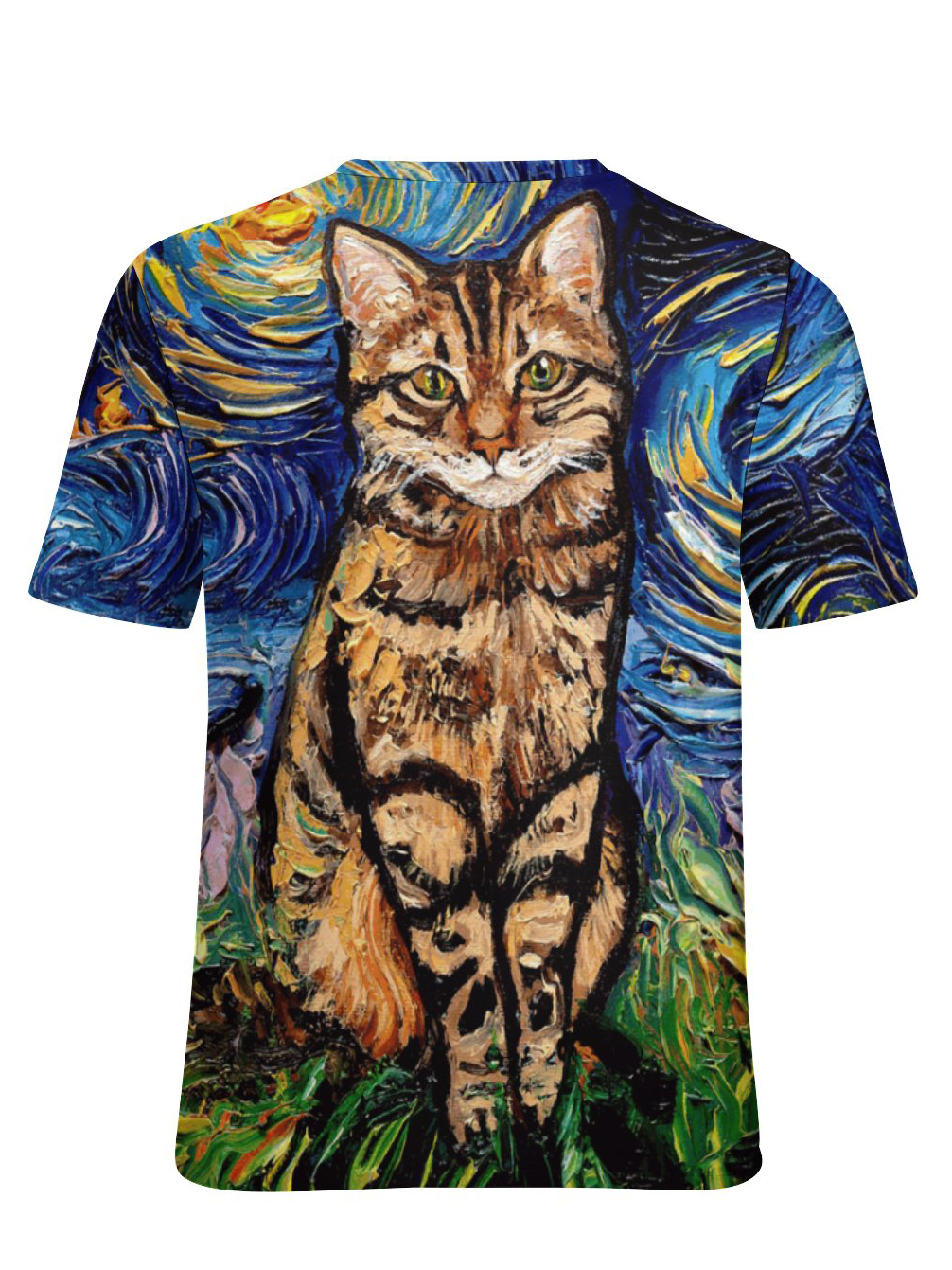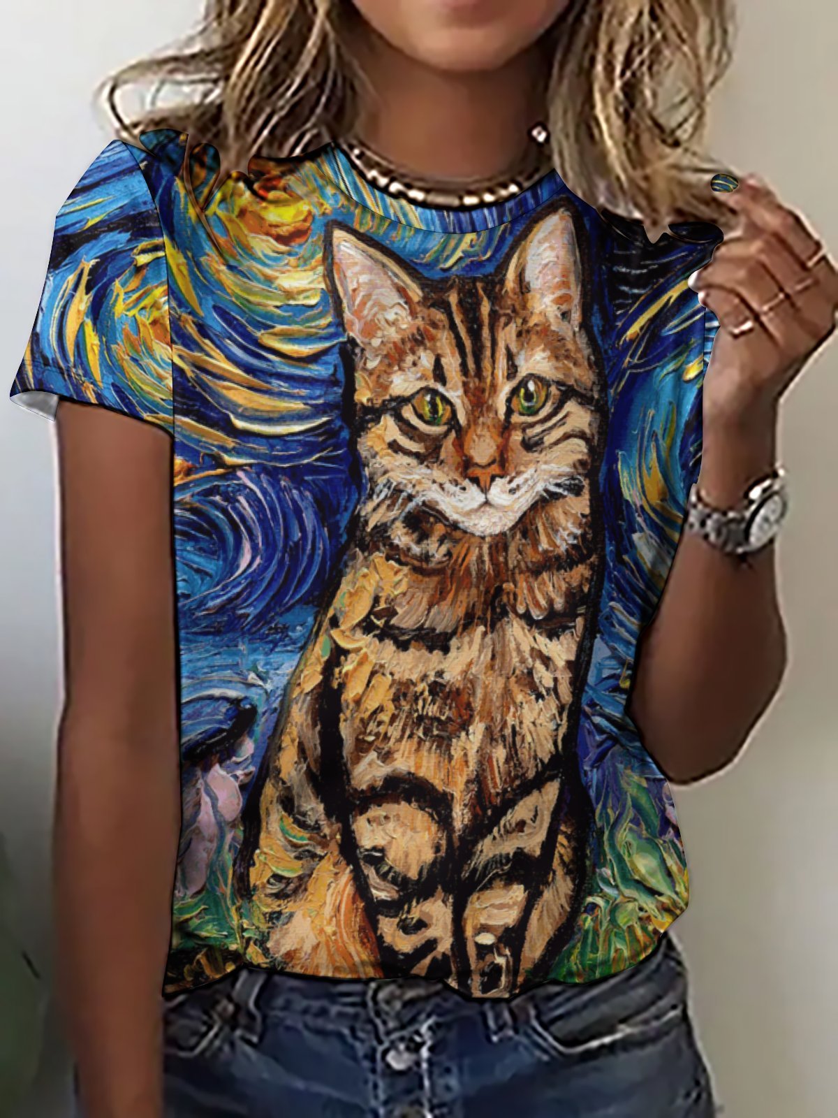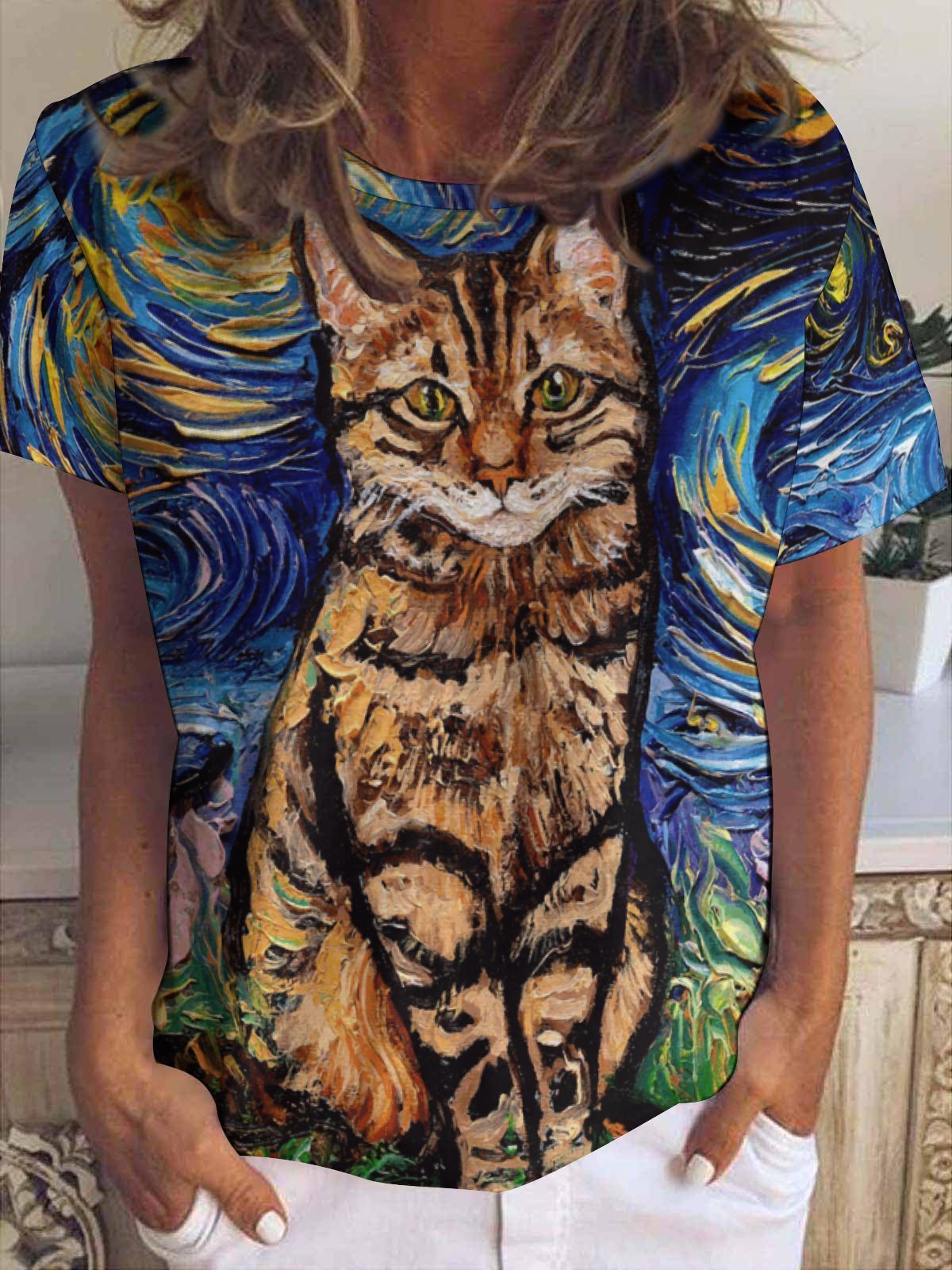 Women Cat Star Night Pattern Casual Loose T-Shirt