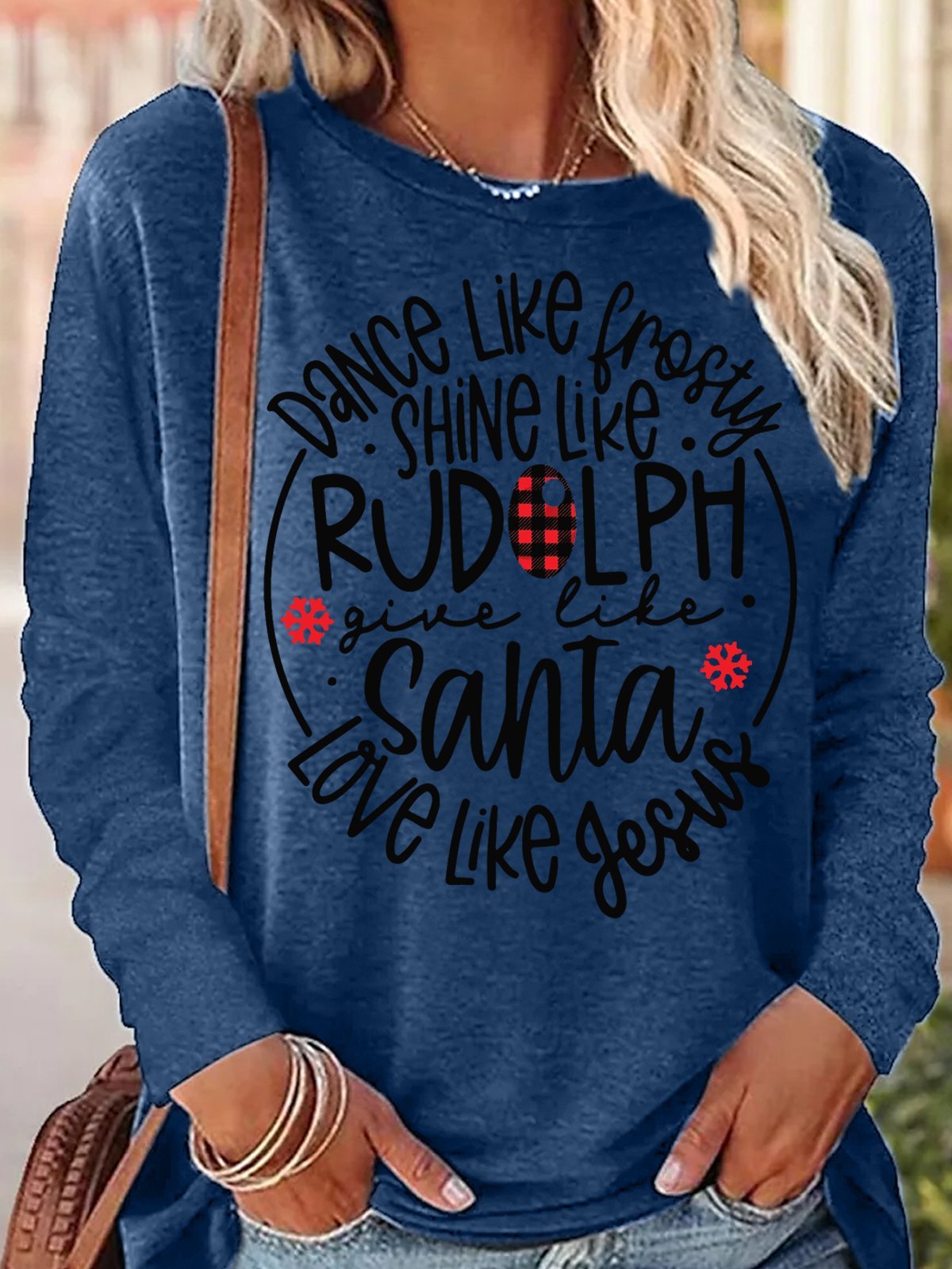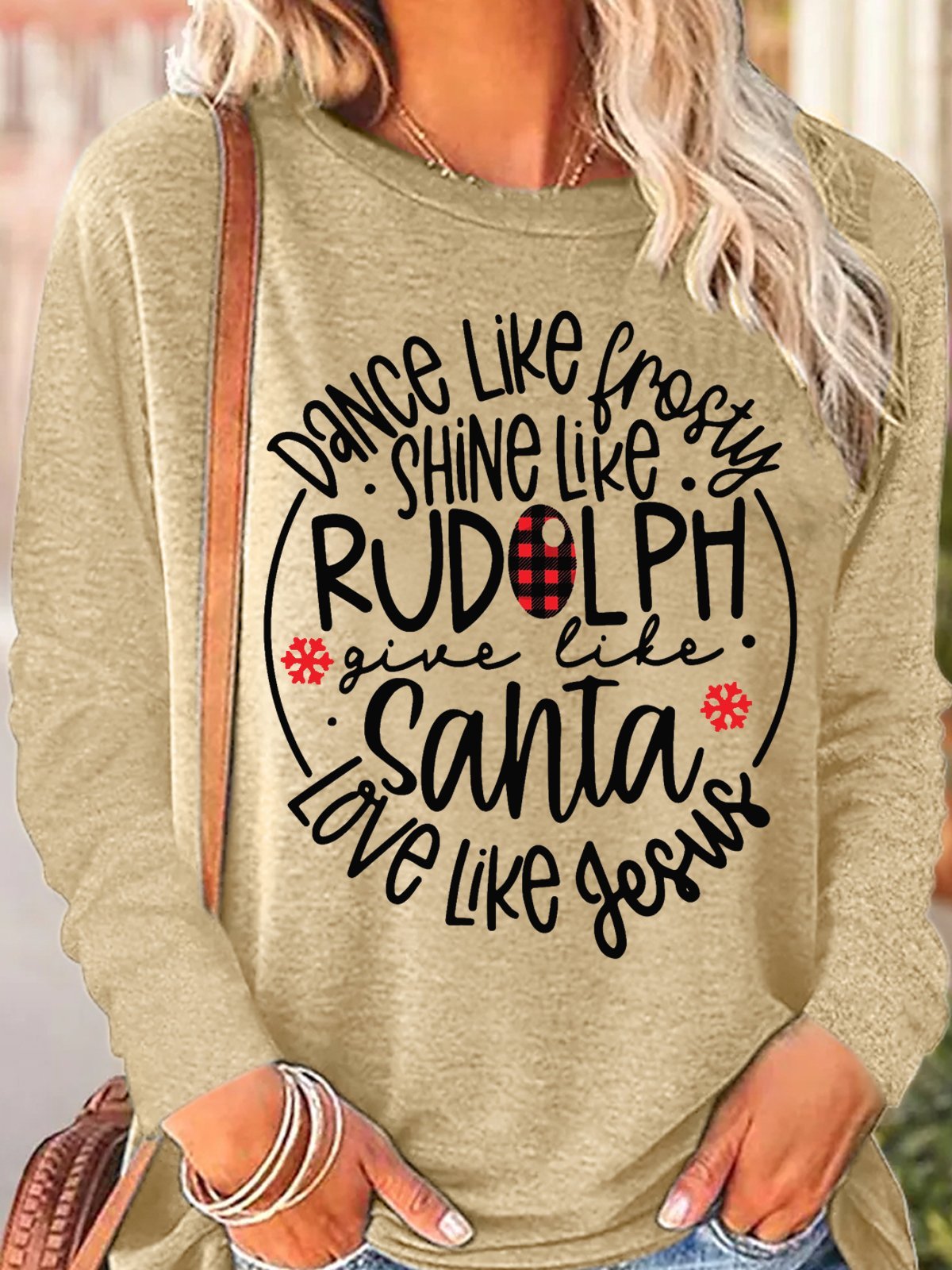 Women's Dance Like Frosty Shine Like Rudolph Give Like Santa Love Like Jesus Christmas Crew Neck Long Sleeve Top
