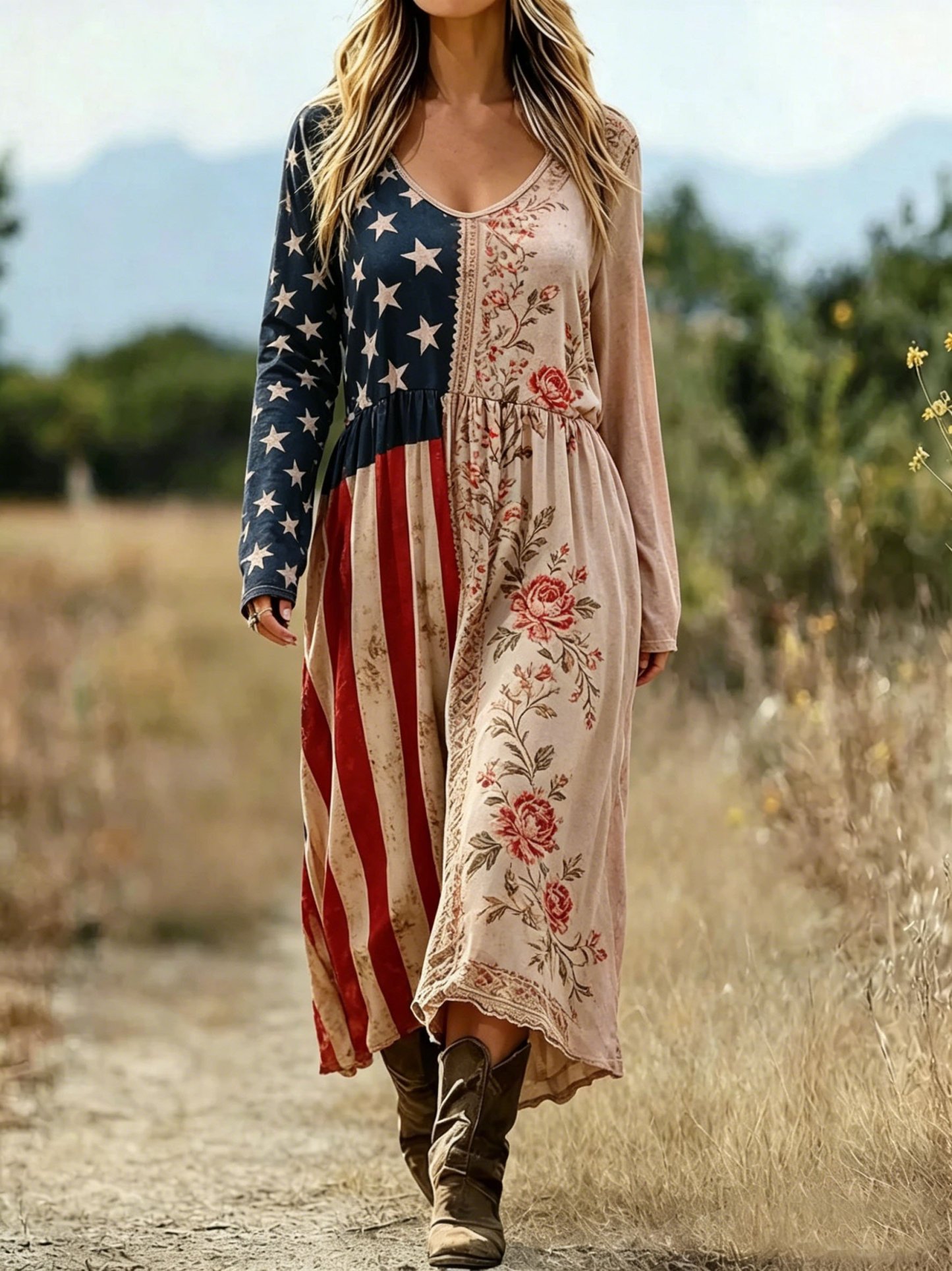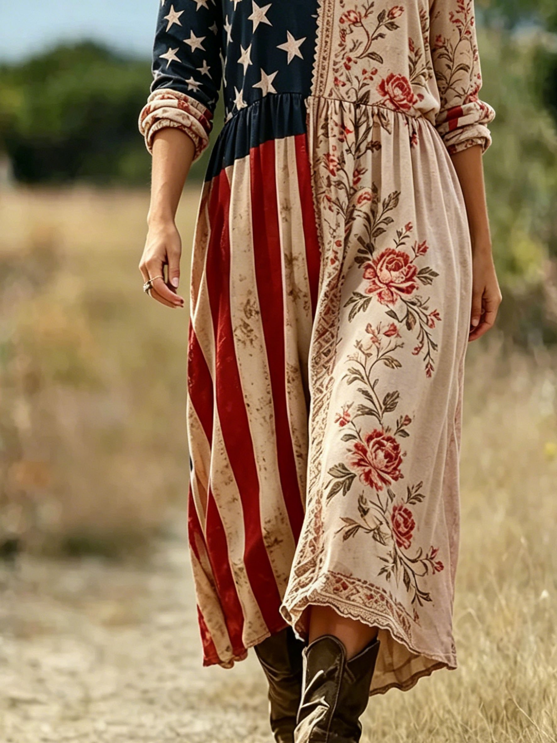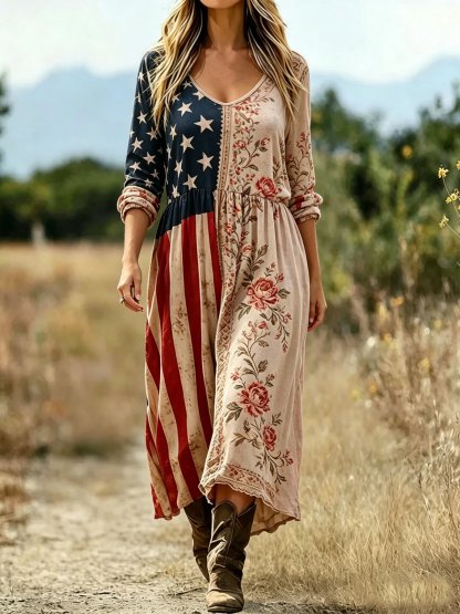 Women Floral V Neck Vintage America Flag Spring Summer A-Line Maxi Dress