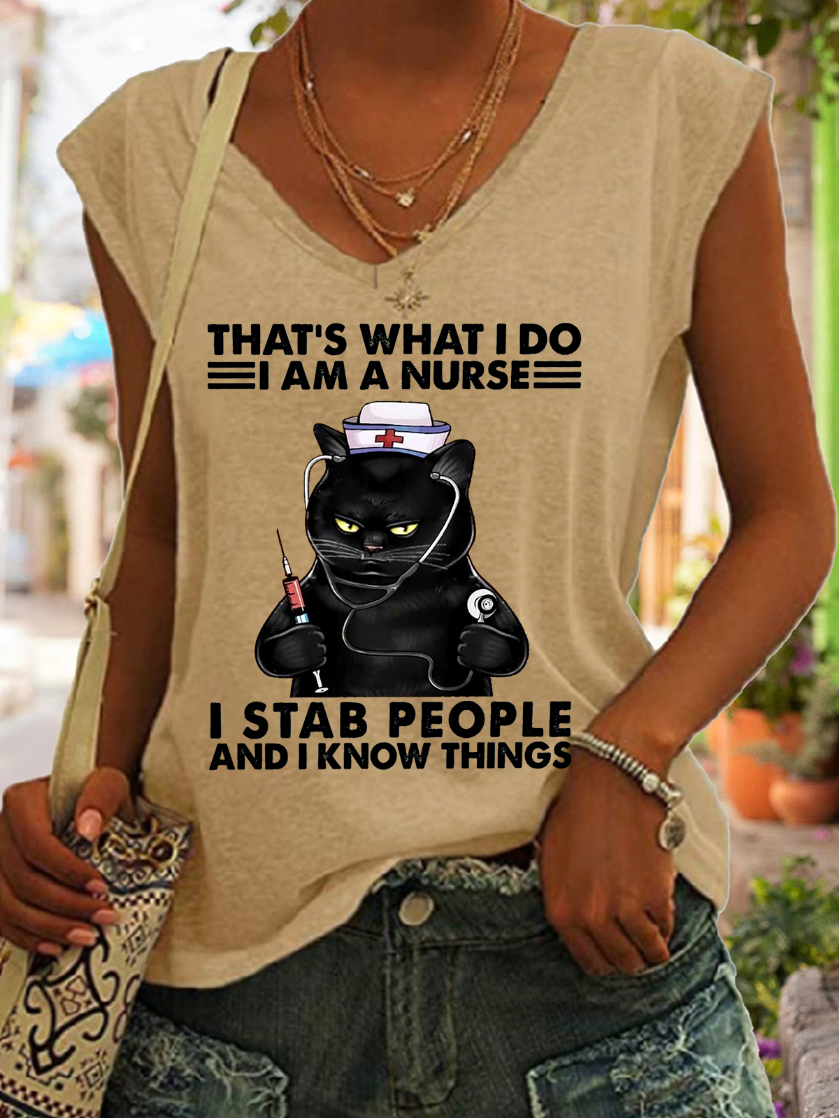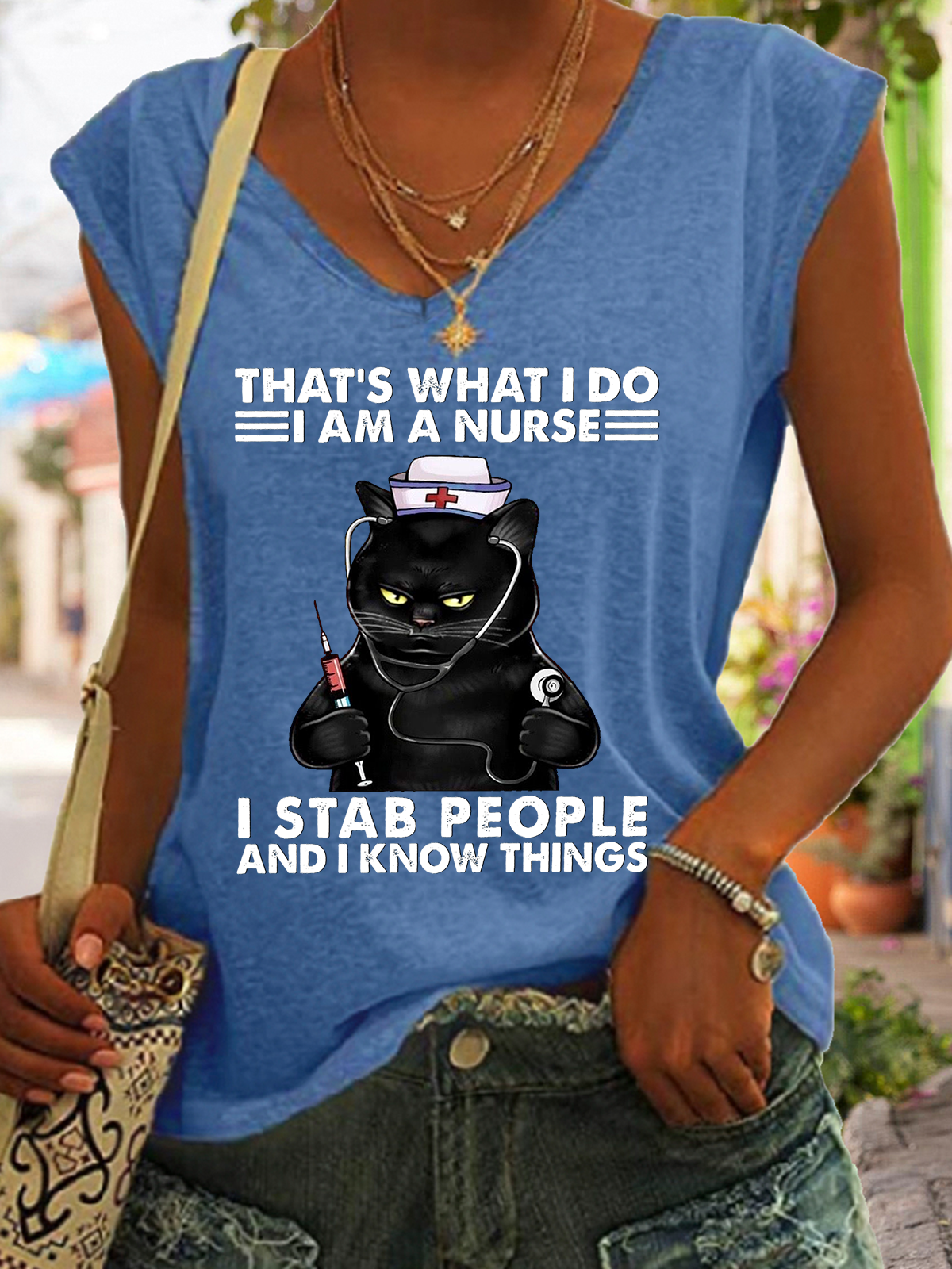 Women‘s Funny Word Black Cat That's What I Do I Am A Nurse Simple V Neck Tank Top