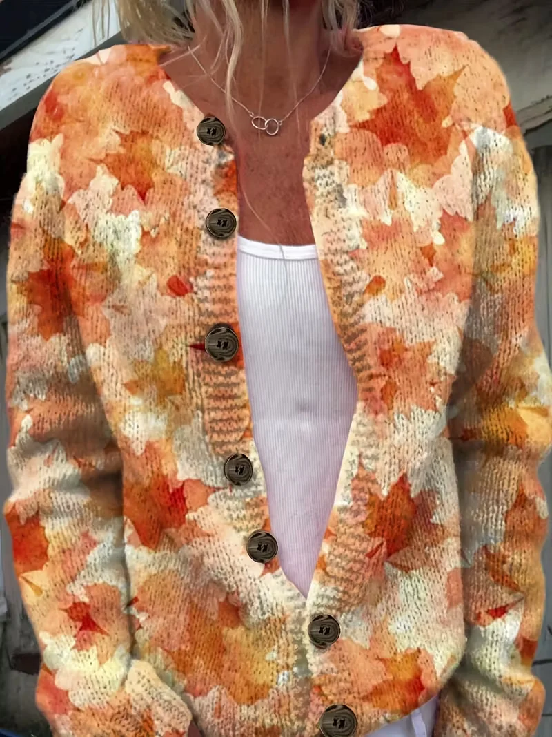 Printing Casual Crew Neck Maple Leaf Cardigan