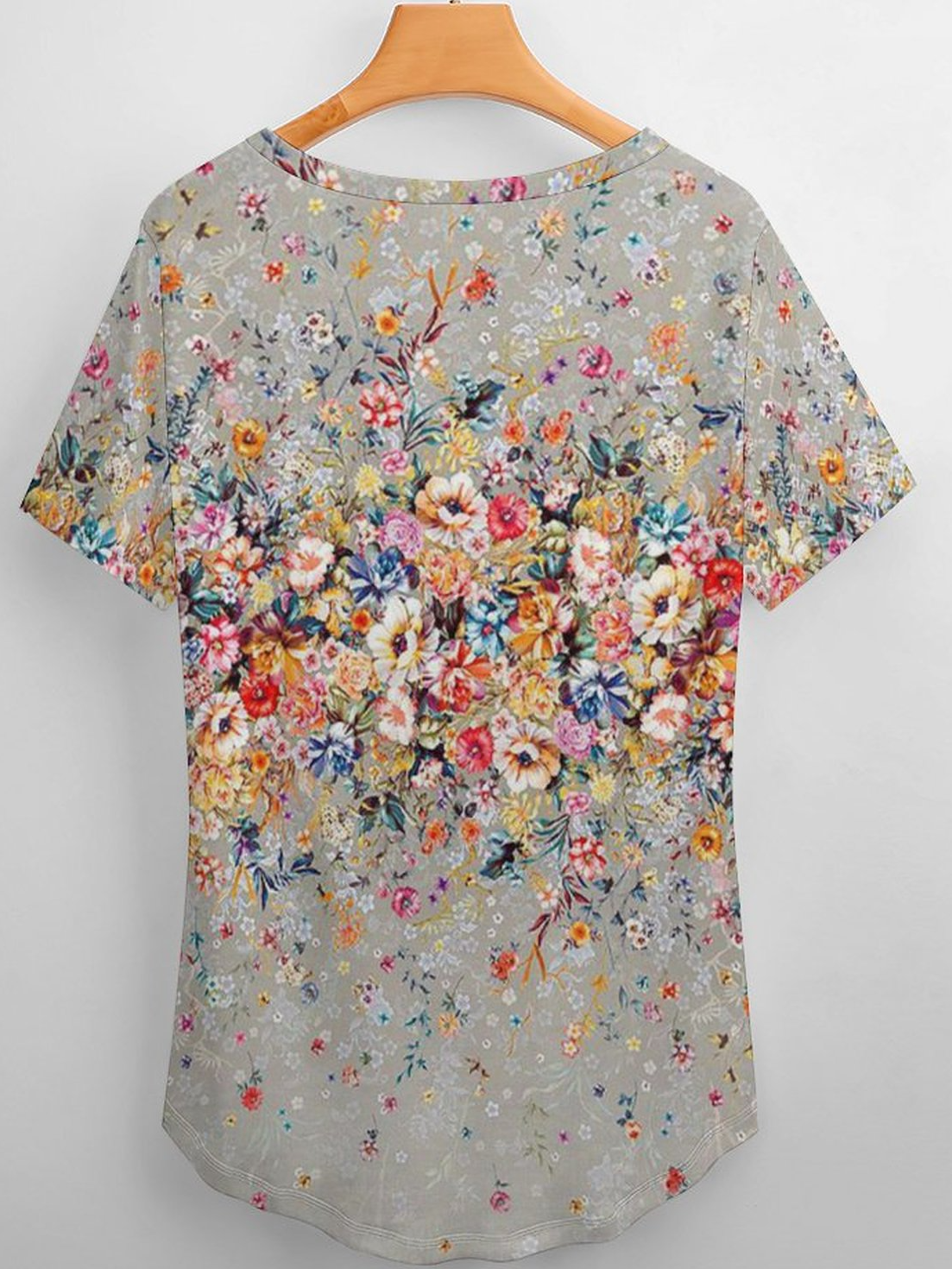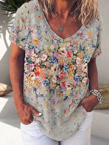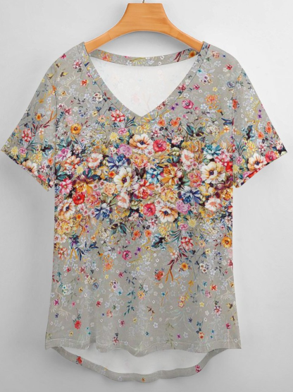 Women's Art Floral Print V Neck Casual Loose T-Shirt