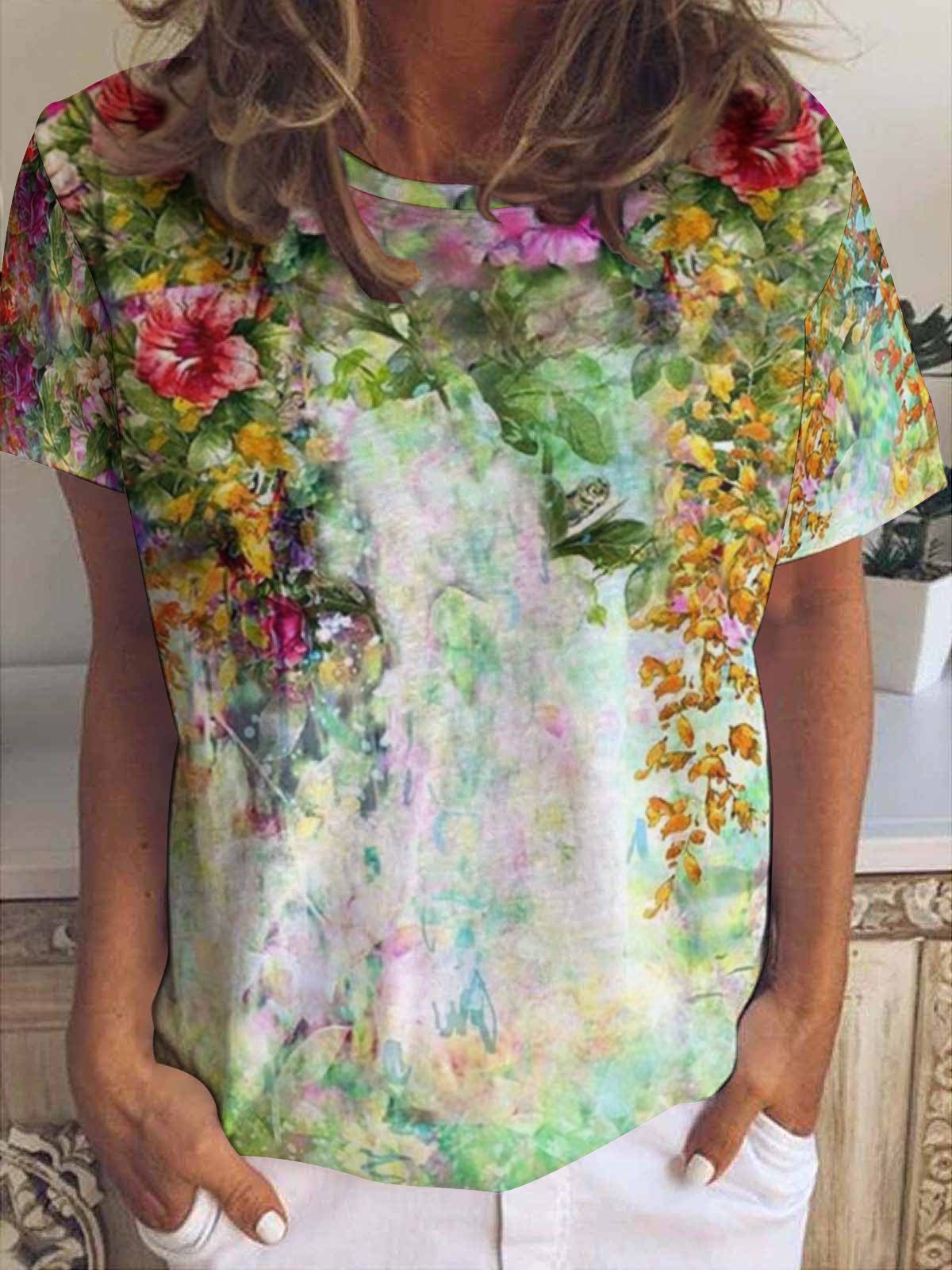 Women's Art Print Floral Casual Crew Neck Loose T-Shirt