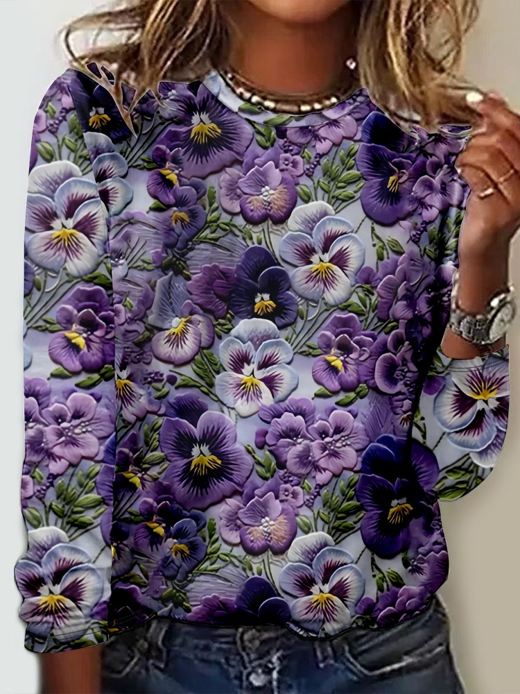 Crew Neck Purple Floral Long Sleeve Shirt