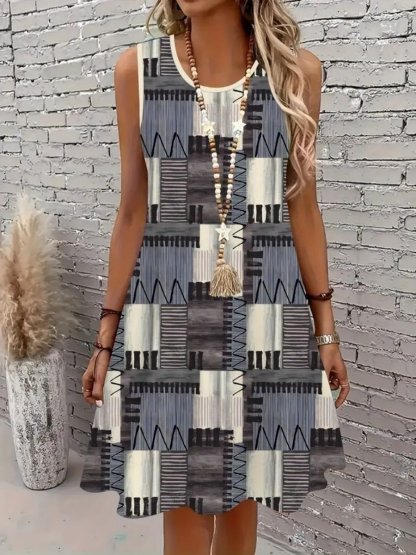 Elegant Loose Crew Neck Geometric Dress With No