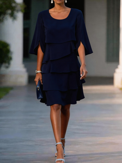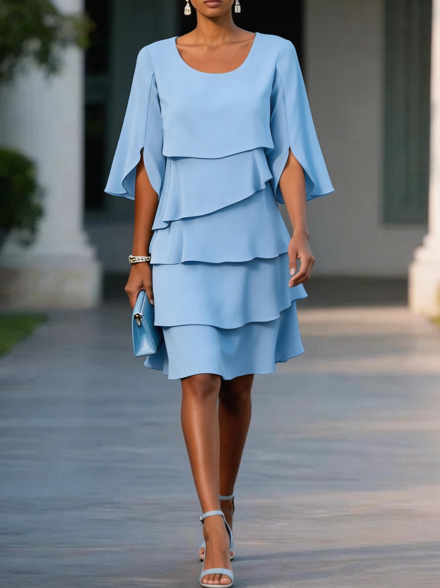 Elegant Multi-Tiered Crepe Dress with Flutter Sleeves - Wrinkle-Resistant A-Line Silhouette