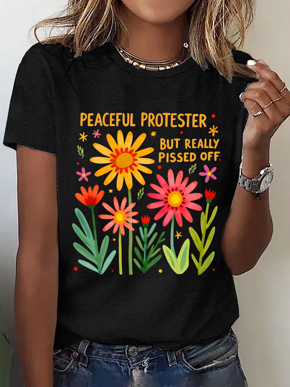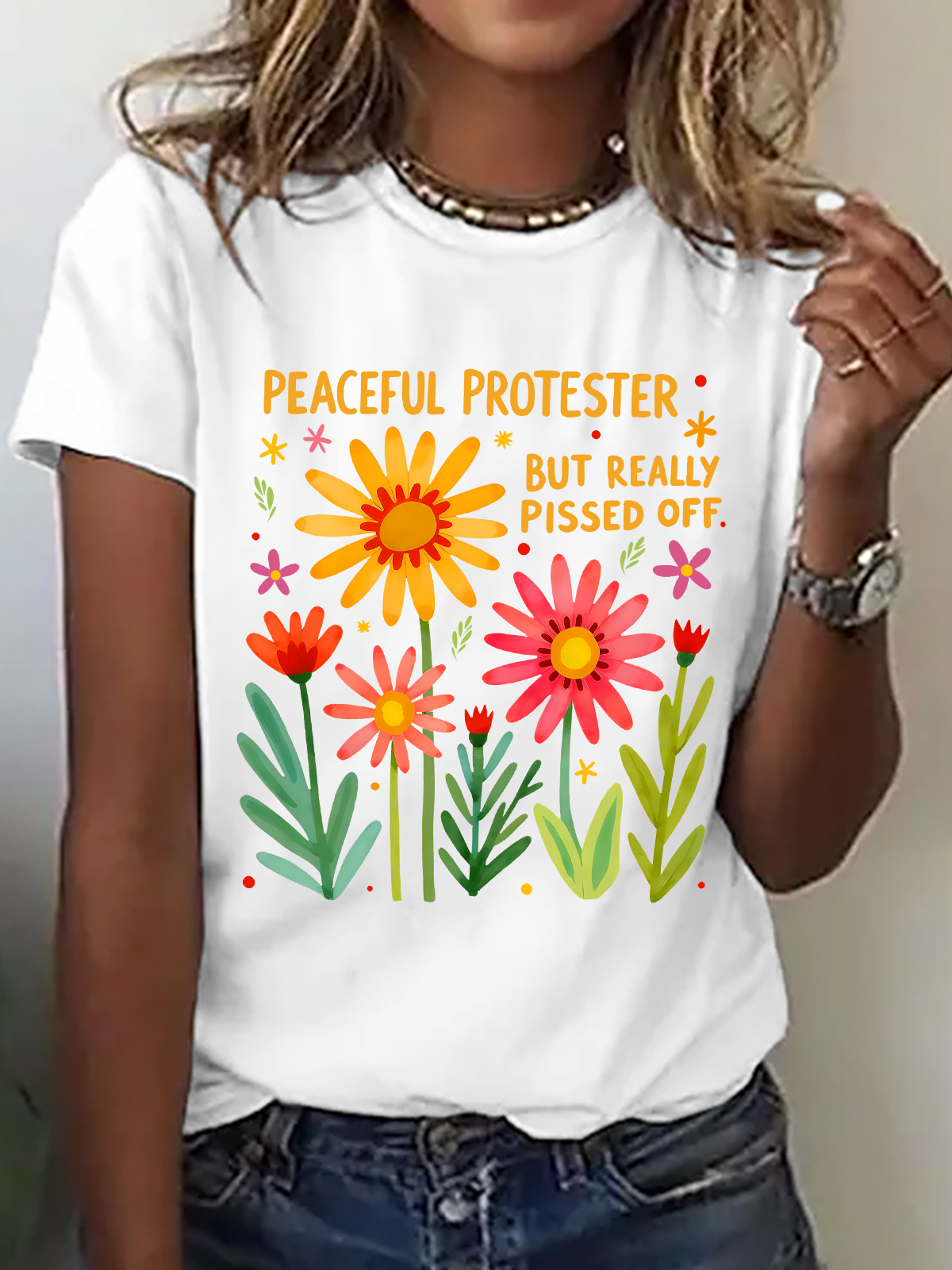 Feminist , Peaceful But Pissed Off Floral Cotton T-Shirt