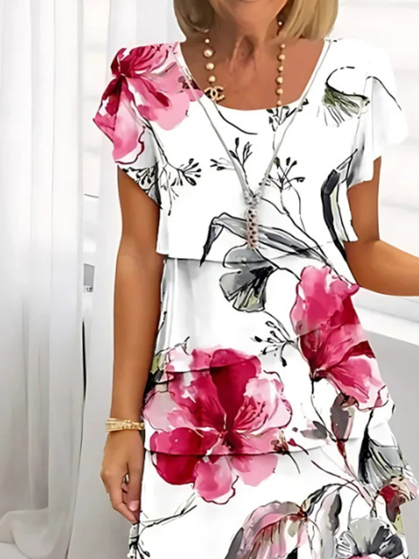 Floral Print Casual Crew Neck Short Sleeve Spring/Summer Chiffon Dress