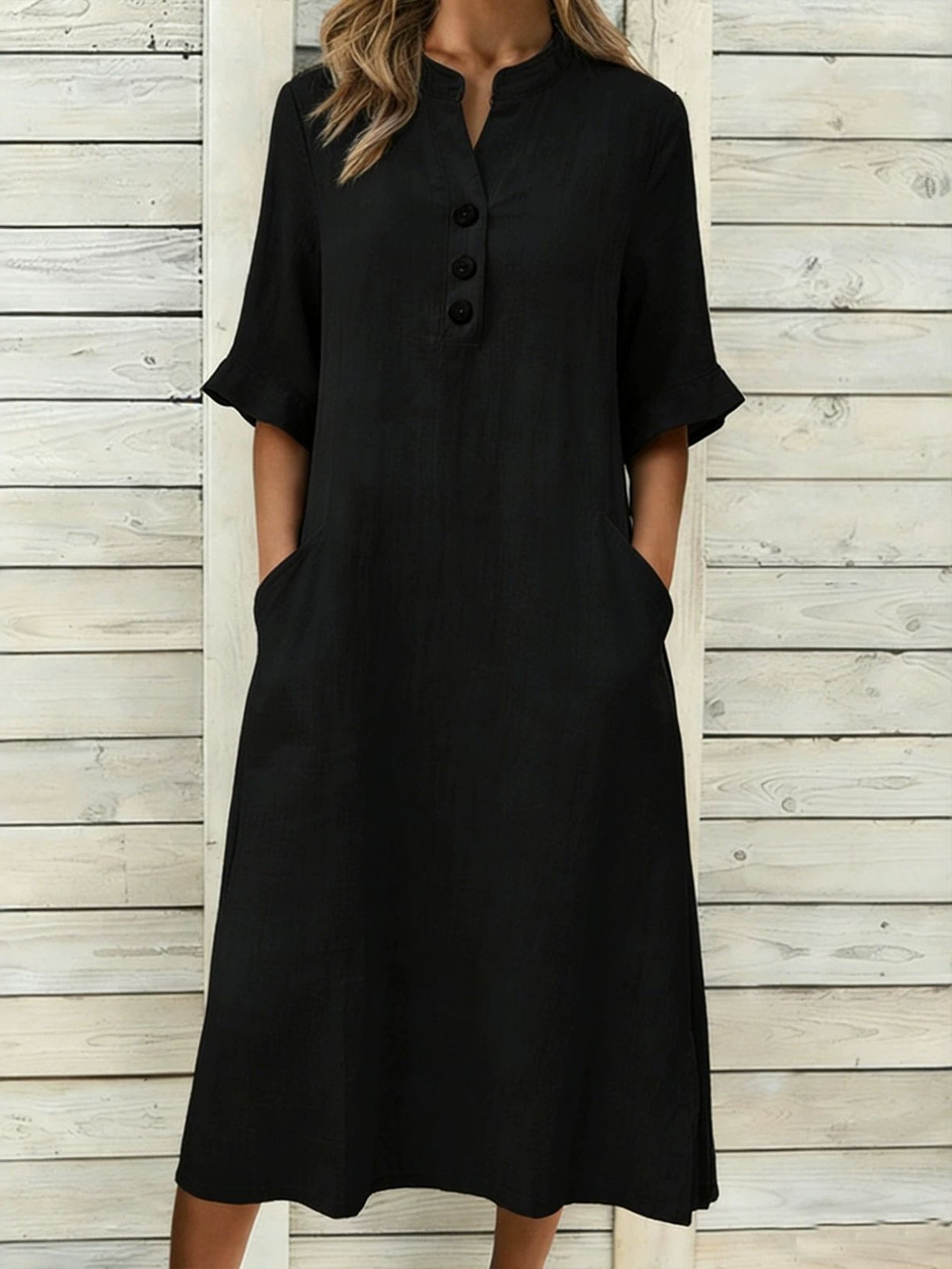 Plain Cotton Linen V Neck Short Sleeve Button Casual Midi Dress