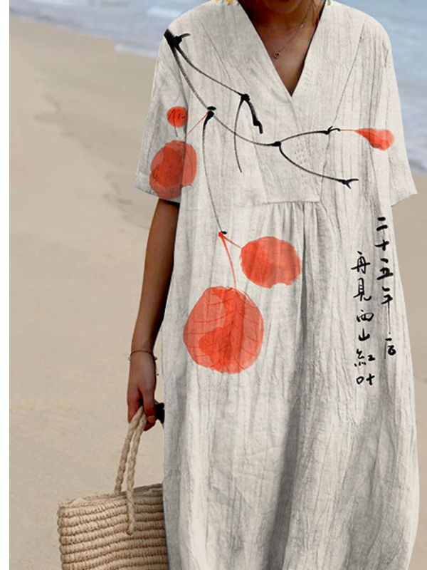 Vintage Ink Wash Painting V Neck Casual Midi Dress
